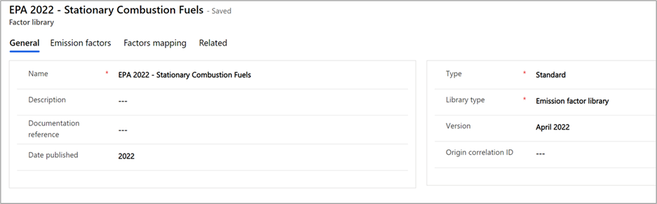 Sie speichern die Faktorenzuordnung in der Faktorbibliothek. Eine Bibliothek ist ein Container mit Emissionsfaktoren und der Zuordnung von Faktoren für ein bestimmtes Jahr und eine Version.