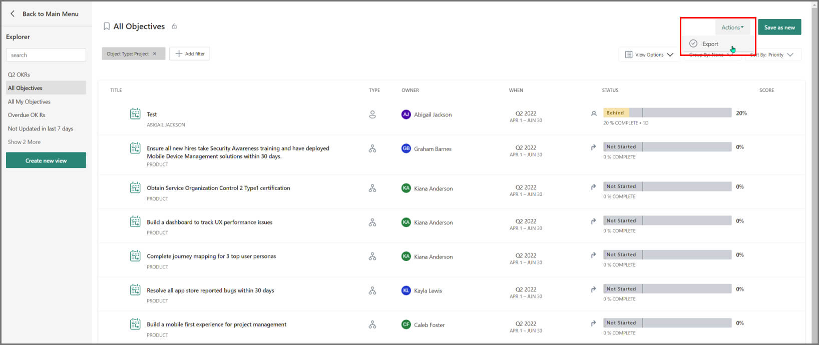 - Sie können Explorer verwenden, um OKRs und Initiativen zu exportieren. Wechseln Sie im menü Standard zu Explorer. Sie können die Ansicht Alle Ziele verwenden, wenn Sie alle OkRs exportieren oder gewünschte Filter wie Zeitraum oder Besitzer anwenden möchten.