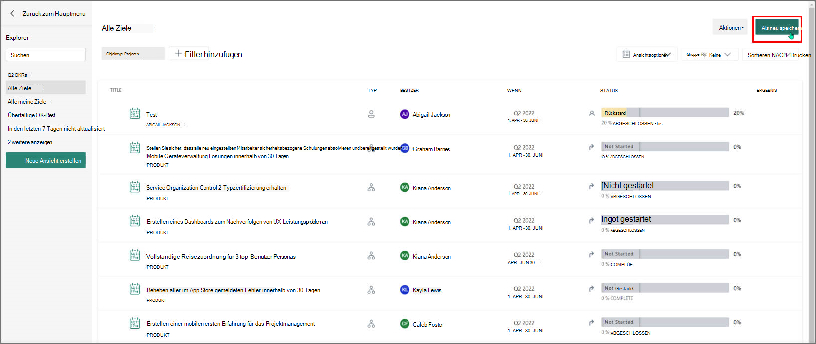 mit Viva Goals können Sie benutzerdefinierte Ansichten erstellen und die häufig verwendeten Filter speichern.