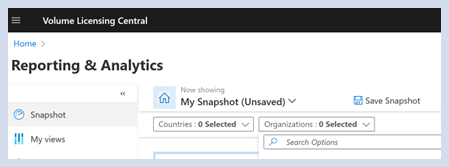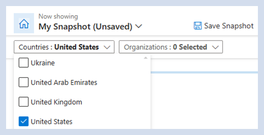 Wählen Sie auf der Startseite "Reporting & Analytics " Ihr Land/Ihre Endbenutzerorganisation aus, um Momentaufnahmendaten für Ihre ausgewählten Kunden anzuzeigen. Sie können auch schnell suchen und Ihre Kundenorganisation(n) auswählen. Beachten Sie, dass eine Länderauswahl die Organisationsliste nur auf das ausgewählte Land/die ausgewählten Länder eingrenzen würde.