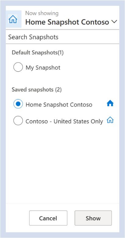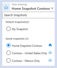 Hinweis: Eine gespeicherte Momentaufnahme entspricht einem gespeicherten Dashboard. Eine gespeicherte Momentaufnahme kann als Standardmomentaufnahme so festgelegt werden, dass sie jedes Mal, wenn Sie sich beim Reporting & Analytics-Arbeitsbereich anmelden, auf der Startseite angezeigt wird.