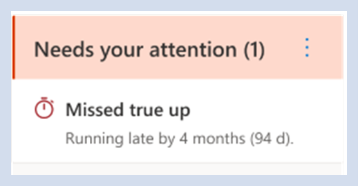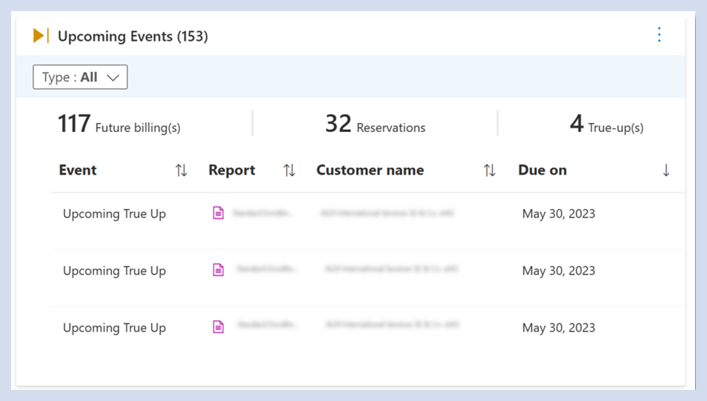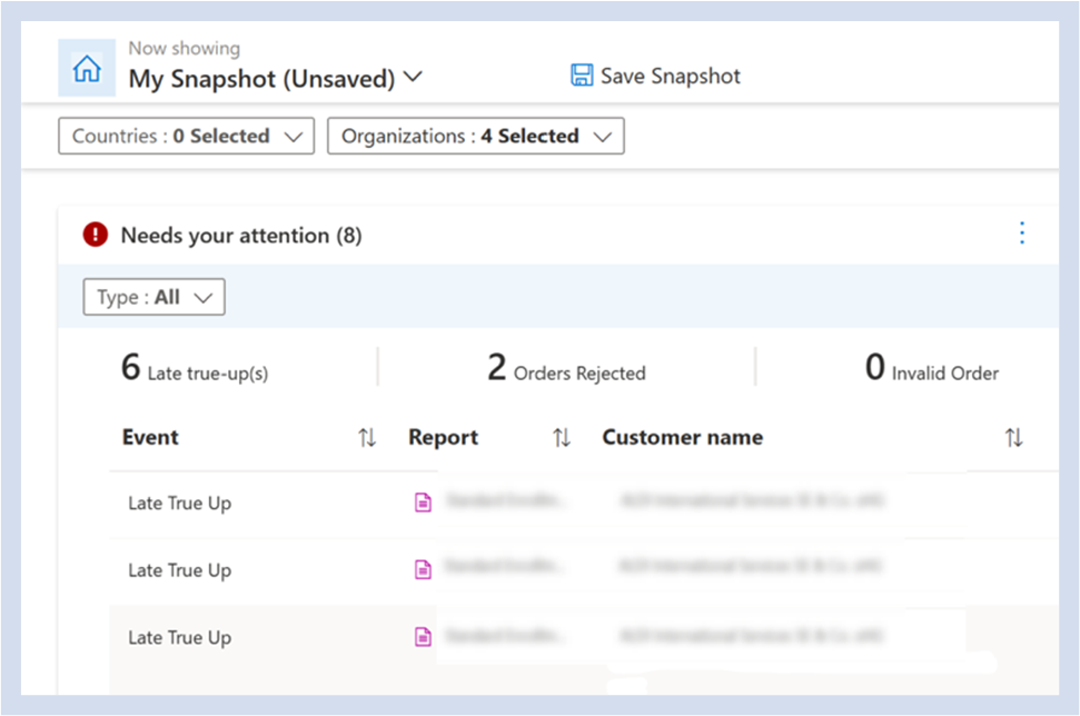 Sobald Ihre Organisation(en) ausgewählt ist, können Sie sehen , dass Sie ihre Aufmerksamkeit für alle verspäteten True-Ups mit dem Berichtsnamen und dem Kunden benötigen, der es ist. Sie können mithilfe des Dropdownmenüs "Typ " nach den folgenden möglichen Ereignissen filtern: