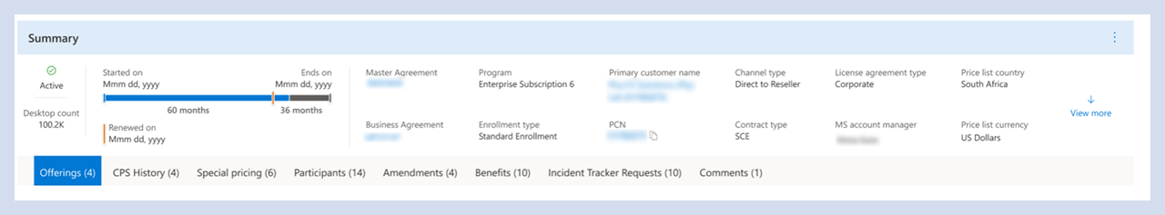 Die Vereinbarungsübersicht bietet Abschnitte zu allen relevanten Vereinbarungsinformationen, einschließlich: