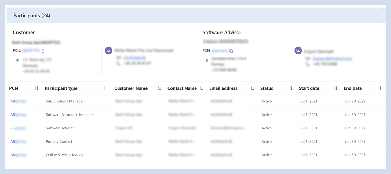 Sehen Sie sich die Teilnehmer des Vertrags an (einschließlich indirekter und/oder direkter Partner und Kunden) und deren Kontaktinformationen.