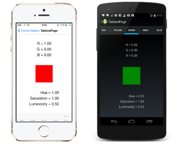 The user interface of a tabbed page consists of a list of tabs and a larger detail area. On iOS, the list of tabs appears at the bottom of the screen, and the detail area is above. On Android and Windows phones, the tabs appear across the top of the screen. The user can scroll the collection of tabs that are across the top of the screen if that collection is too large to fit on one screen.