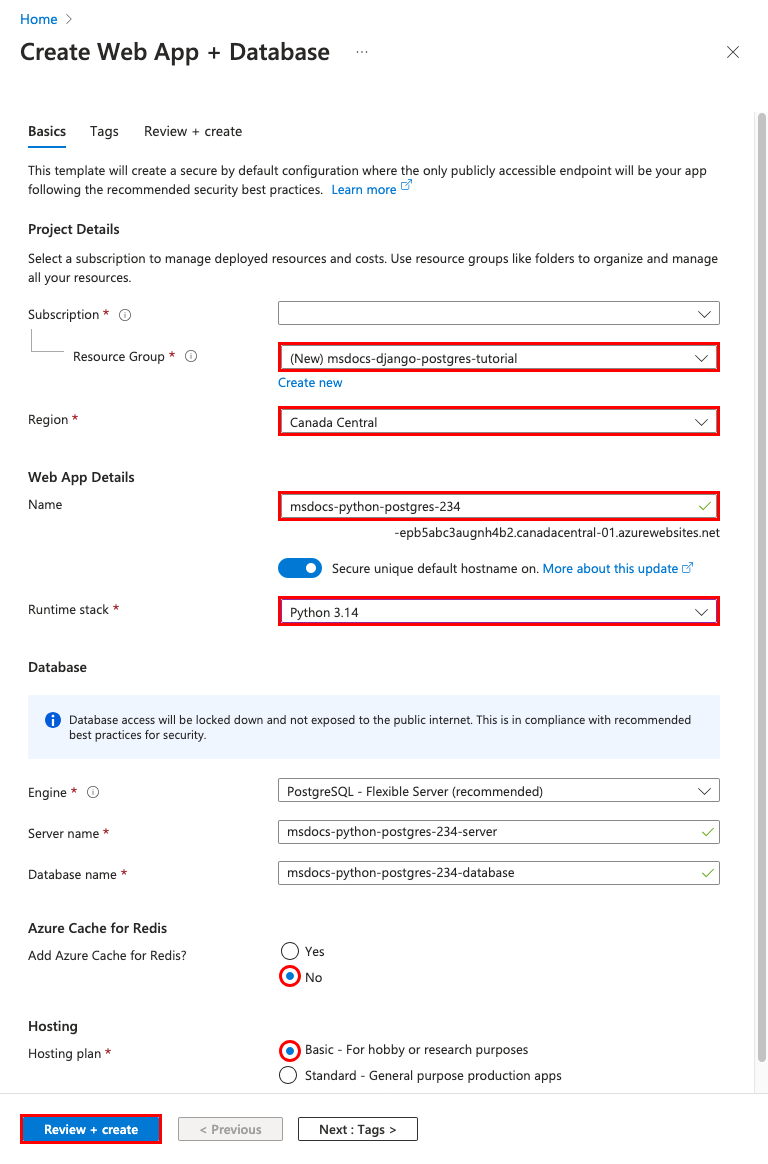 - Hosting plan: Basic. When you're ready, you can scale up to a production pricing tier.