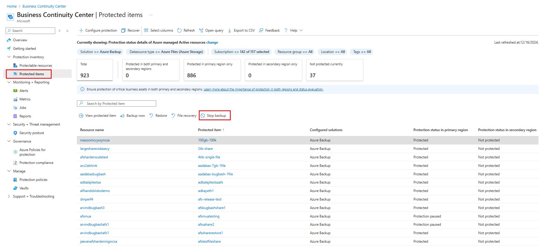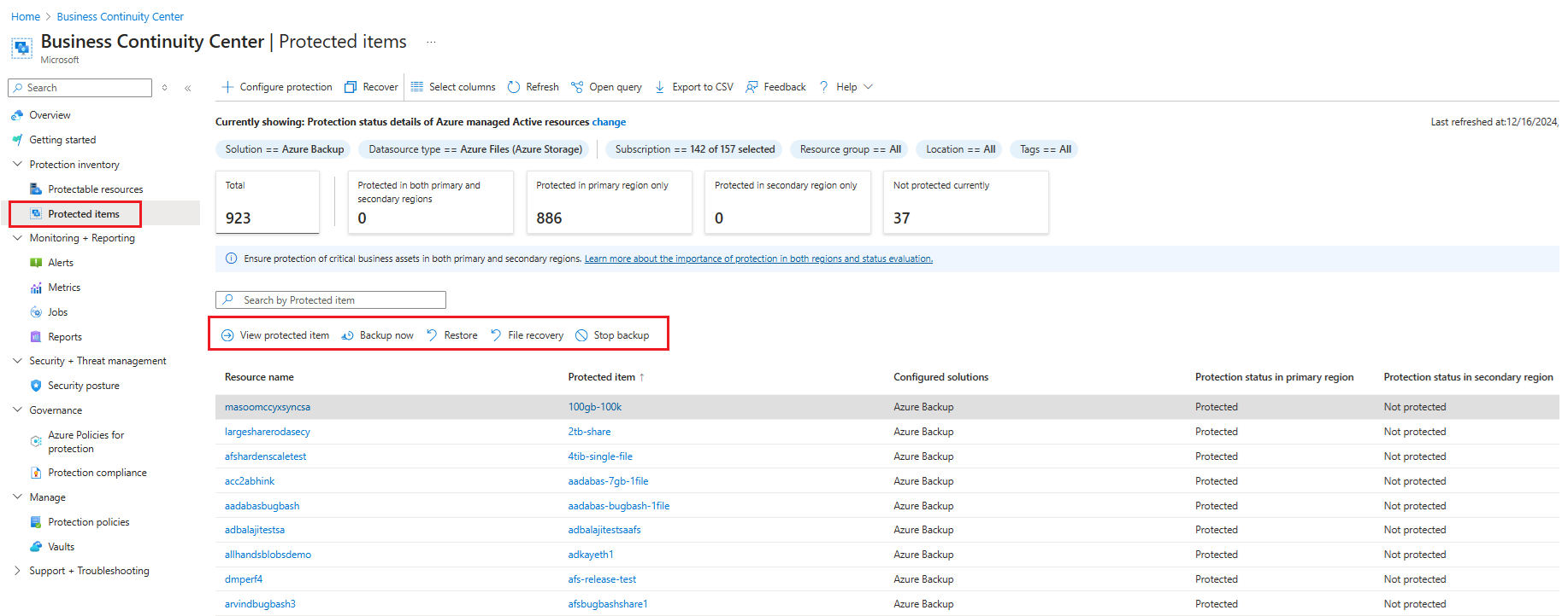 Go to Business Continuity Center > Protected Items, and then select Azure Backup as a Solution and Azure Files (Azure Storage) as the Datasource type.