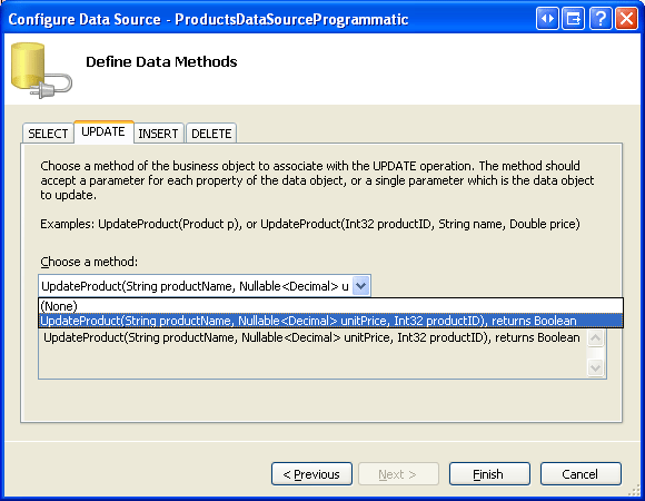 Configure the ObjectDataSource to use the ProductsBLL class and set the drop-down list in the SELECT tab to GetProducts(). In the UPDATE tab, choose the UpdateProduct overload with three input parameters - productName, unitPrice, and productID. Set the drop-down lists to (None) in the INSERT and DELETE tabs.