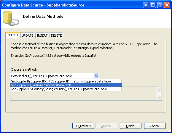 Figure 7: Configure the ObjectDataSource to Use the SuppliersBLL Class s GetSuppliers Method (Click to view full-size image)