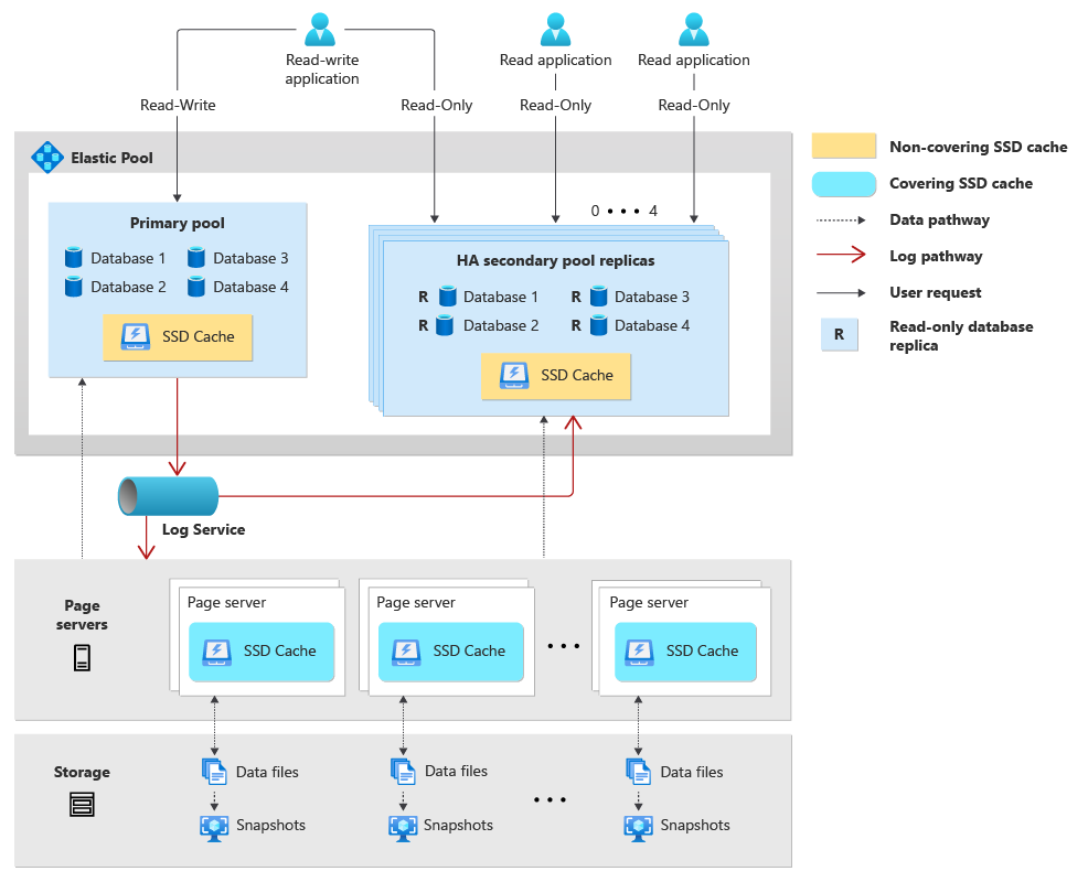 - Hyperscale databases in the primary elastic pool all share the same log service. Since databases in the high availability pools don't have a write workload, they don't utilize the log service.