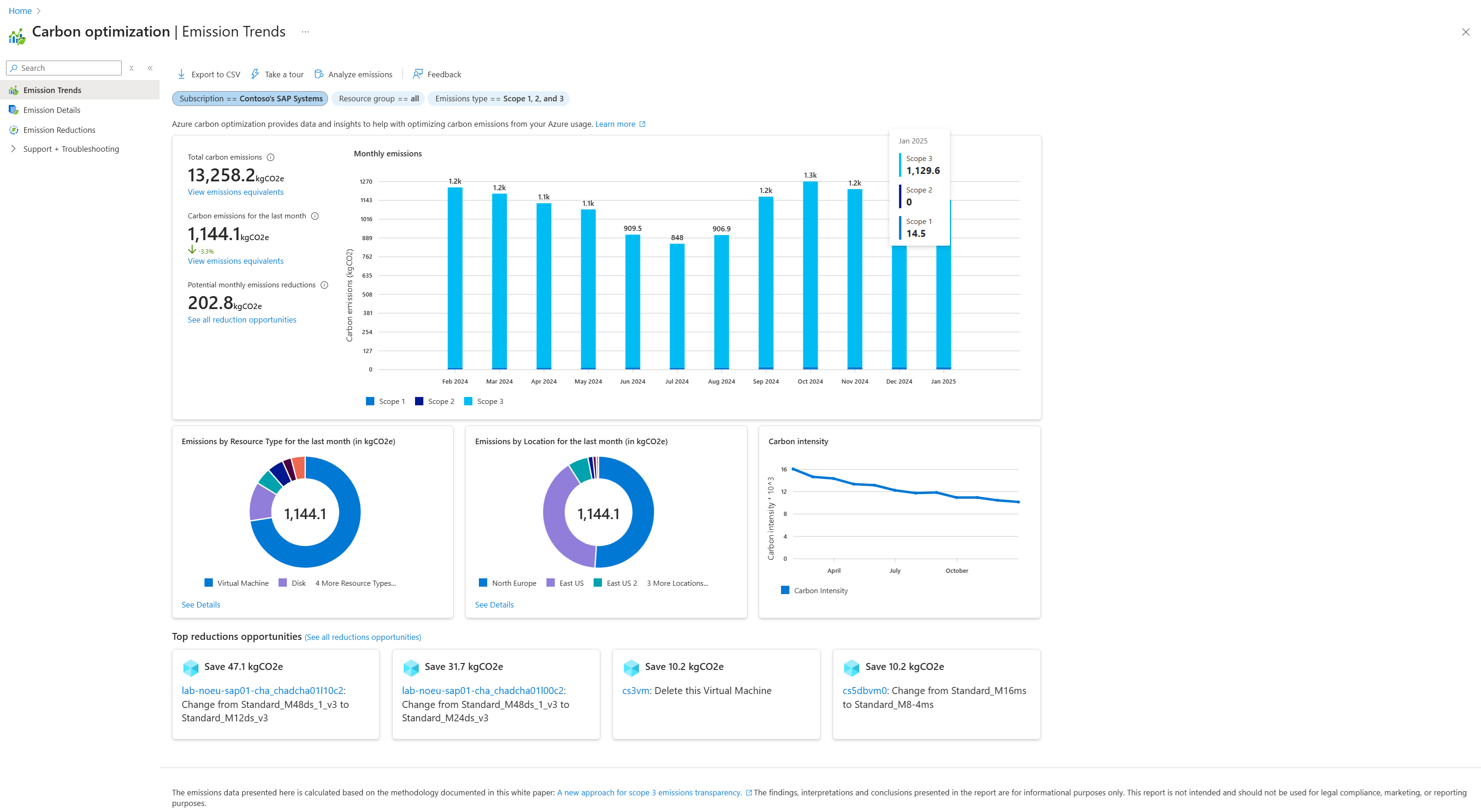 - Breakdown by Resource type and Location - Analyze emissions based on Azure resource type and location to identify major emitters and opportunities for reduction.