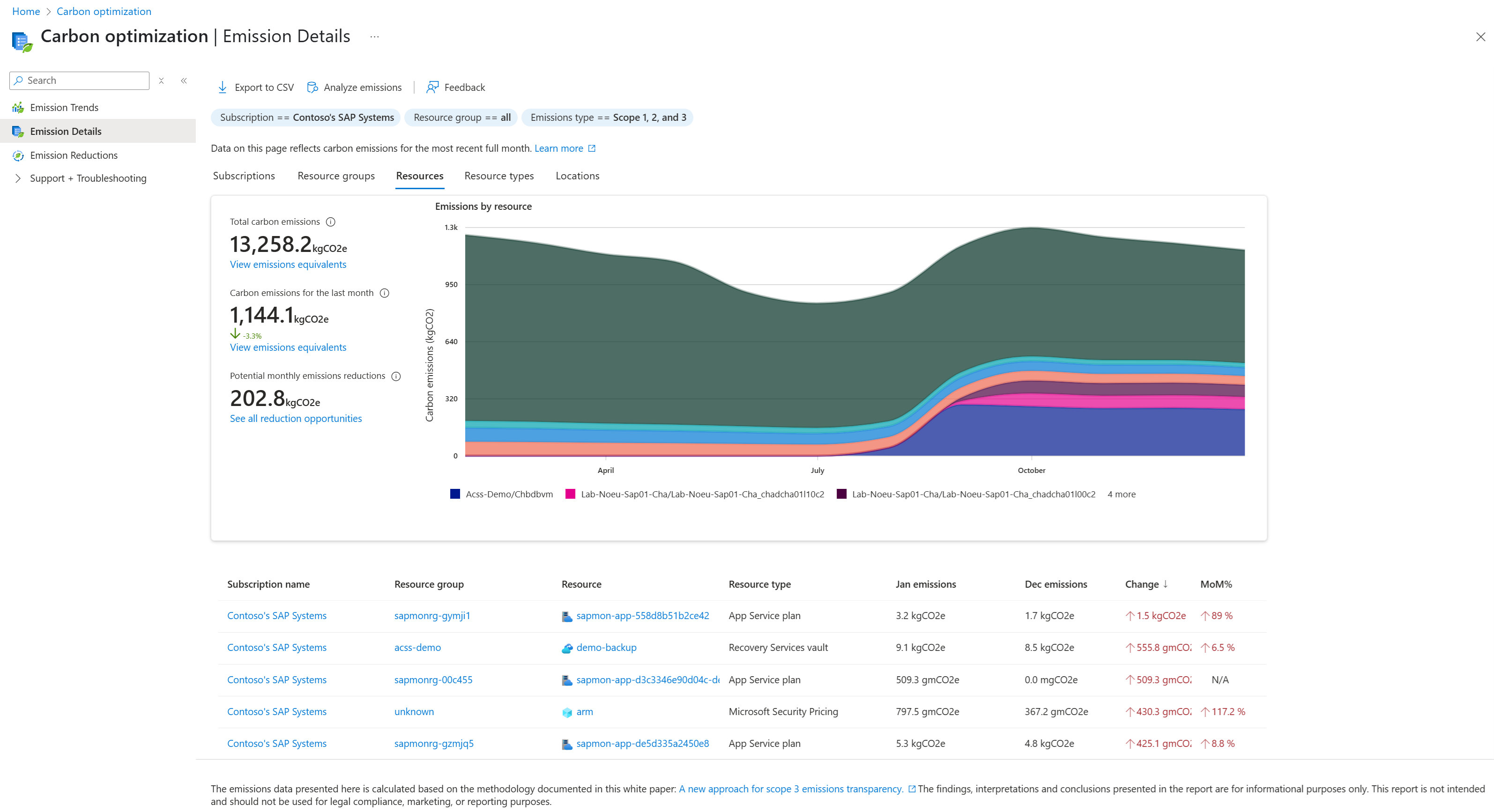 - Sorting - Select column headings to sort emissions data, such as sorting by Change to highlight the largest month-over-month variations.