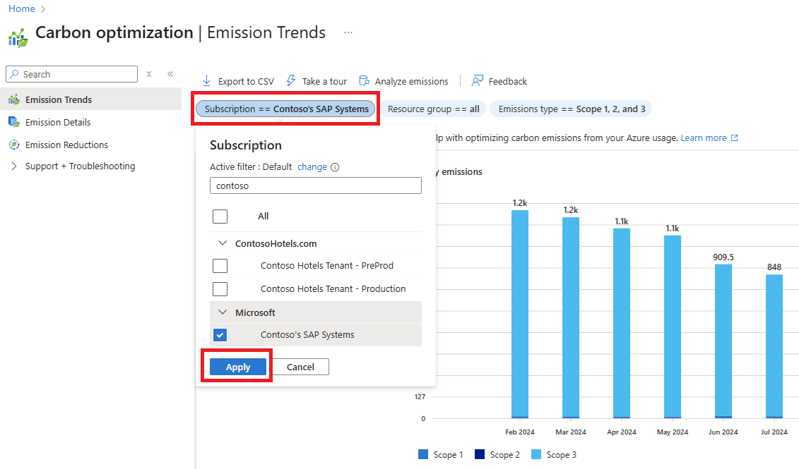 - Use more filters, such as Resource group and Emissions type, to refine the data as needed.