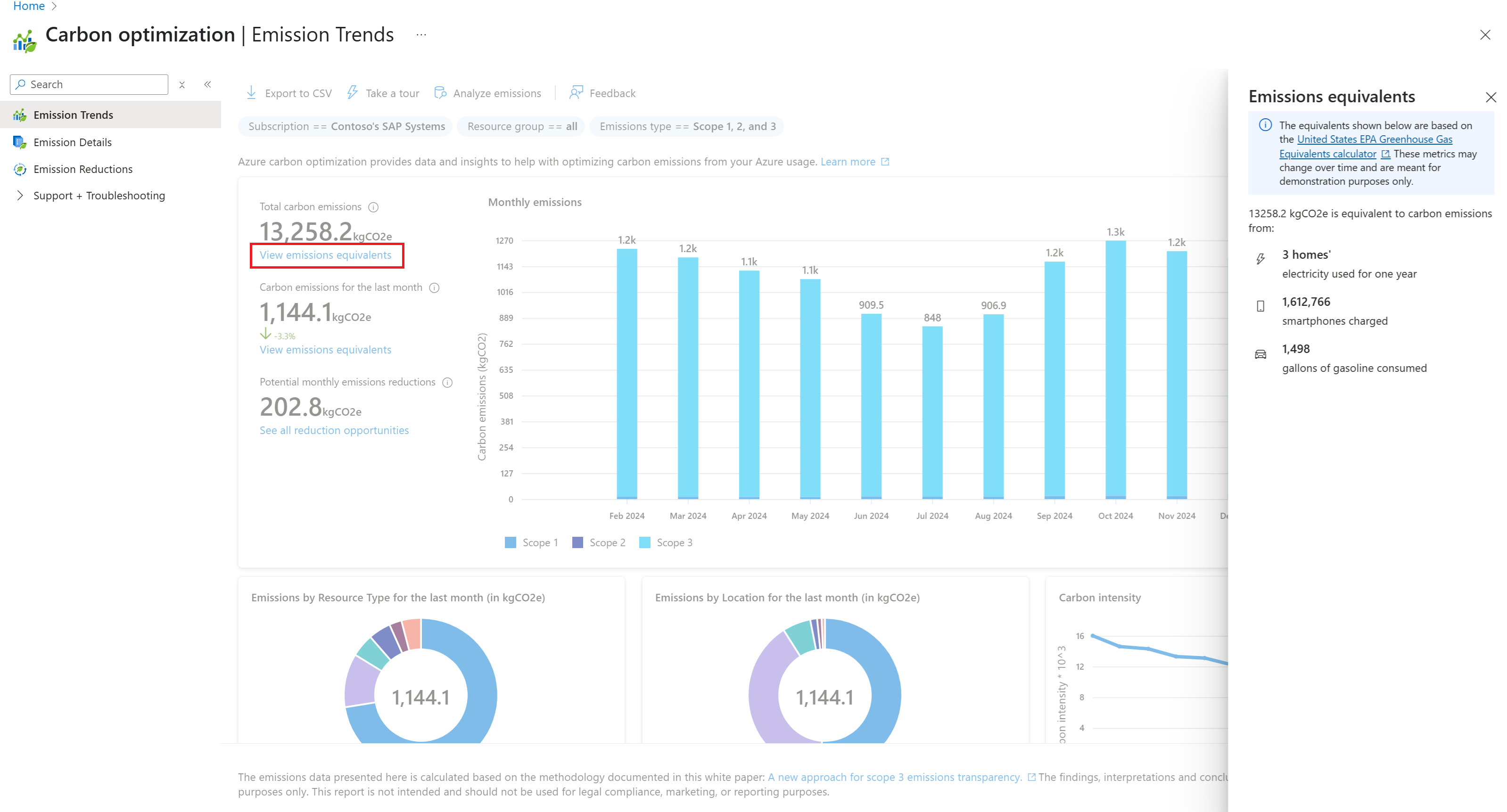 - Emissions Equivalents - Select View emissions Equivalents under Total carbon emissions to see real-world comparisons, based on the EPA Greenhouse Gas Equivalencies Calculator.