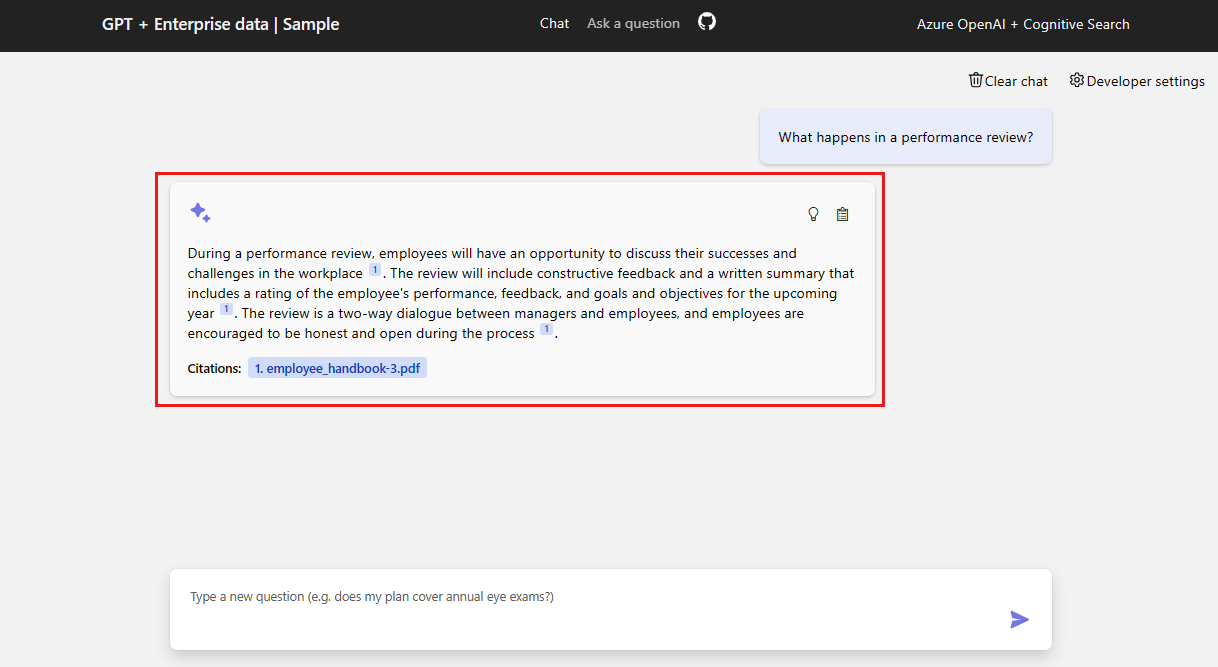 In the chat app, select the What happens in a performance review? option, or enter the same text in the chat text box. The app returns the initial response: