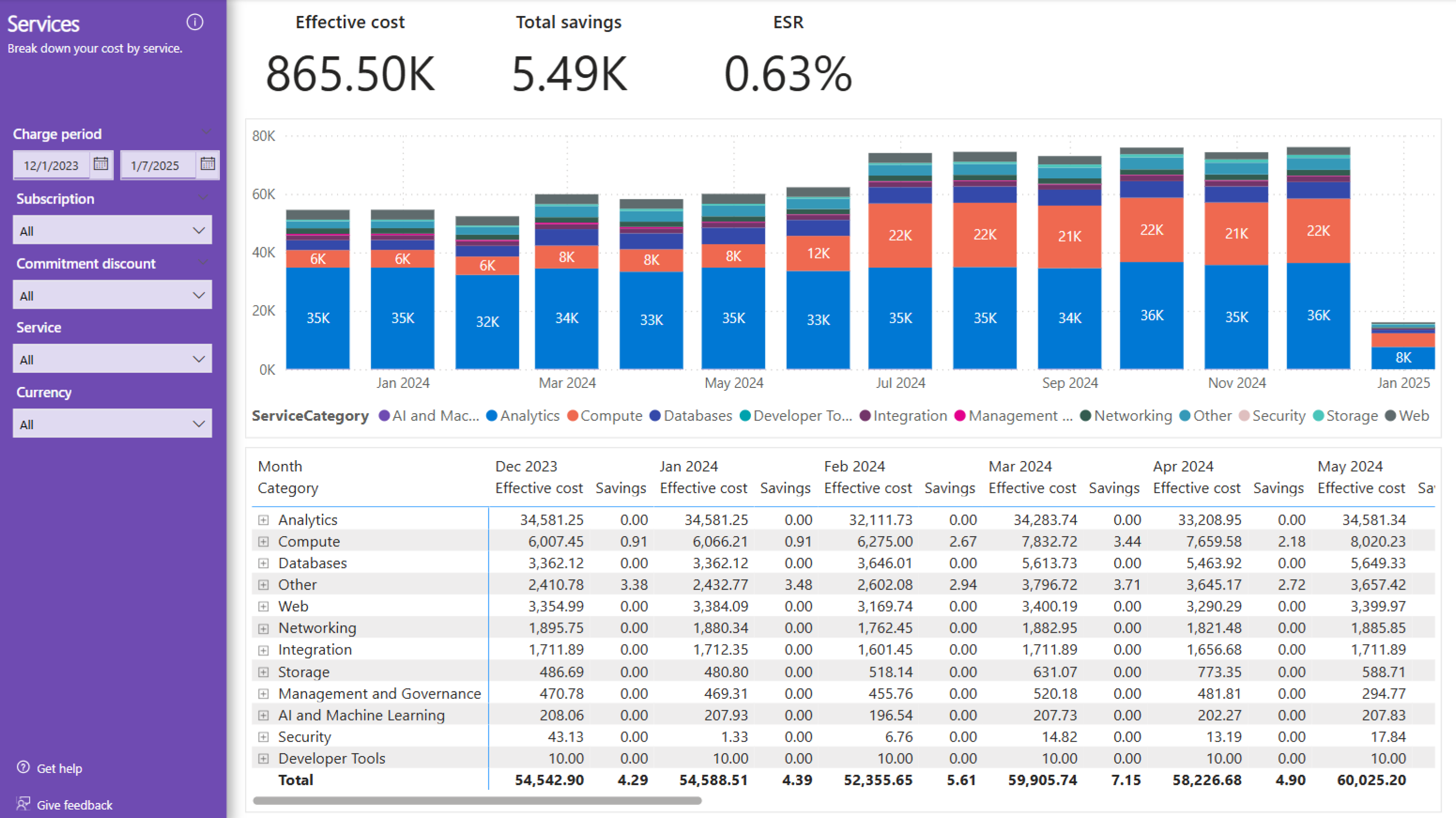 - Effective cost shows the effective cost for the period with reservation purchases amortized across the commitment term.