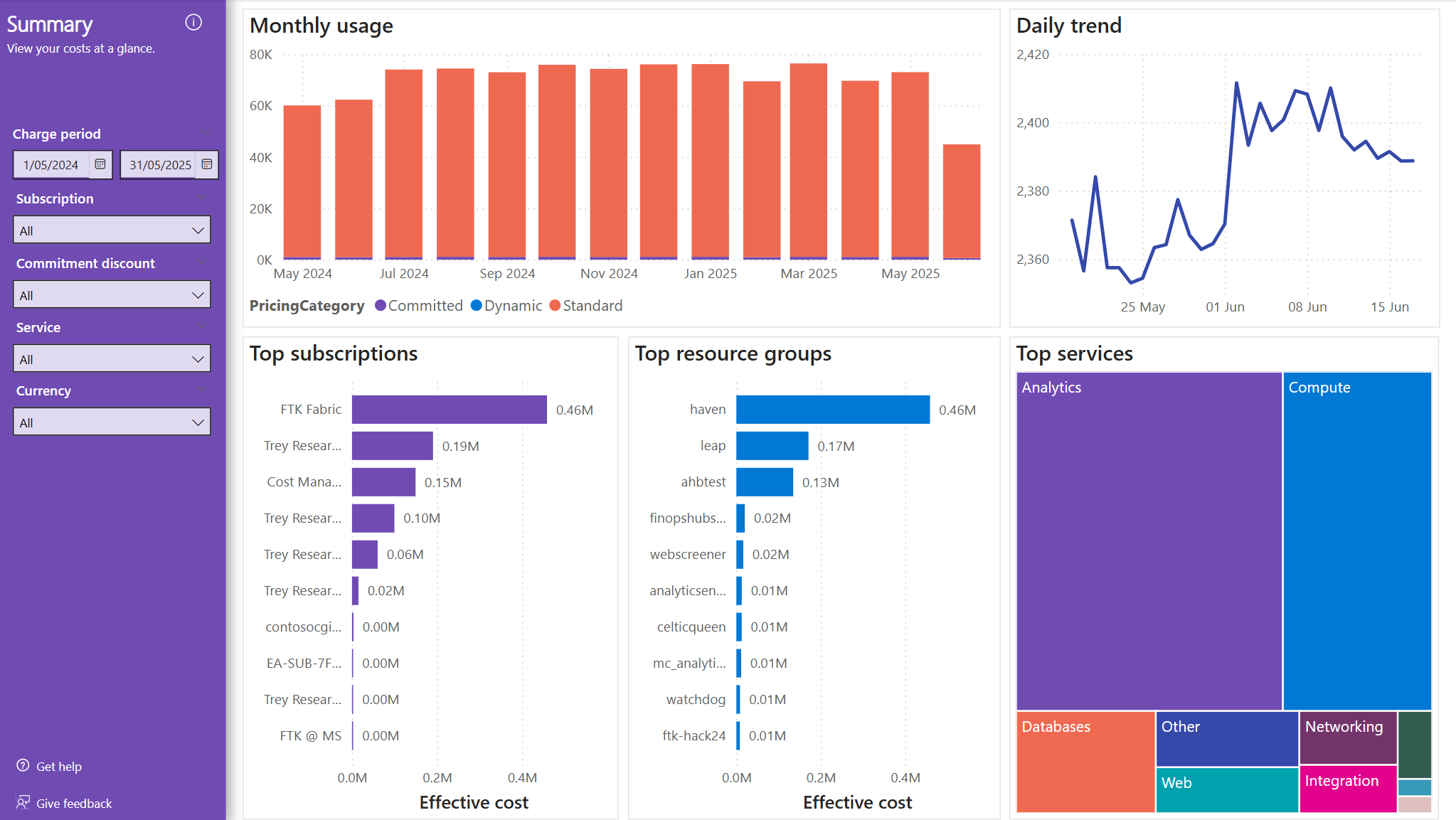 The page uses charts to show the top 10 subscriptions, resource groups and service category spend. Additionally it shows monthly usage broken down by pricing category, with a last 30 days daily spend trend.