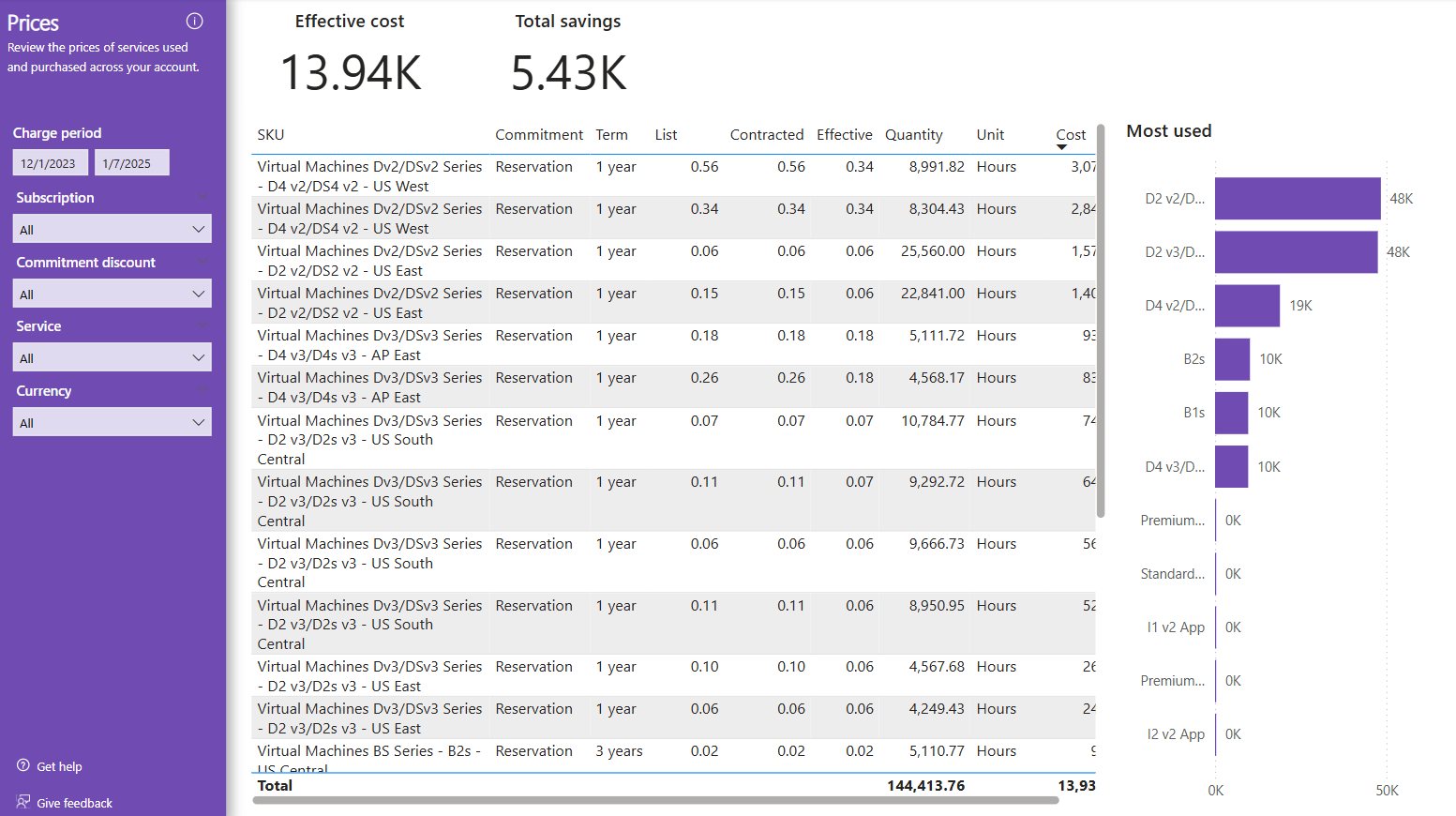 - Effective cost shows the effective cost for the period with reservation purchases amortized across the commitment term.