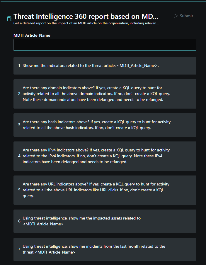 Using this promptbook, you can analyze any external threat intelligence articles to extract indicators from it and gather any relevant Microsoft Defender Threat Intelligence article.