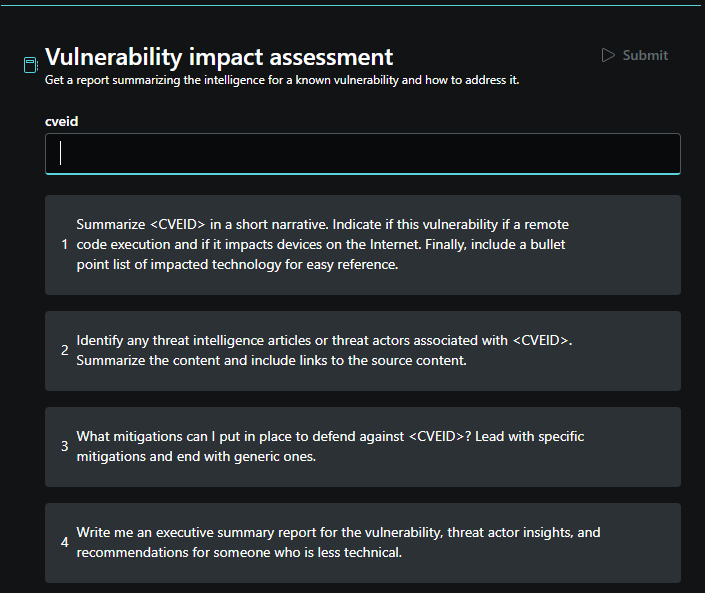 The vulnerability impact assessment promptbook accepts a CVE number or known vulnerability name to find out if the vulnerability has been publicly disclosed or exploited and whether it has been used by threat actors in their campaigns. It can then provide recommendations to address or mitigate the threat and summarize these findings in an executive summary.