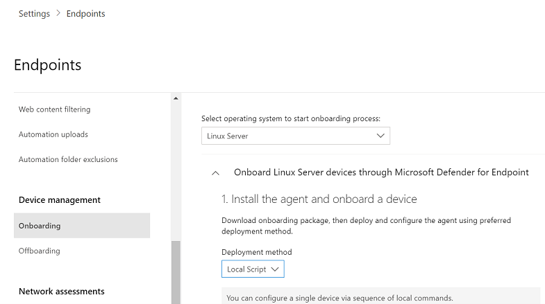 In the Microsoft Defender portal, expand the System section and select Settings > Endpoints > Device management > Onboarding.