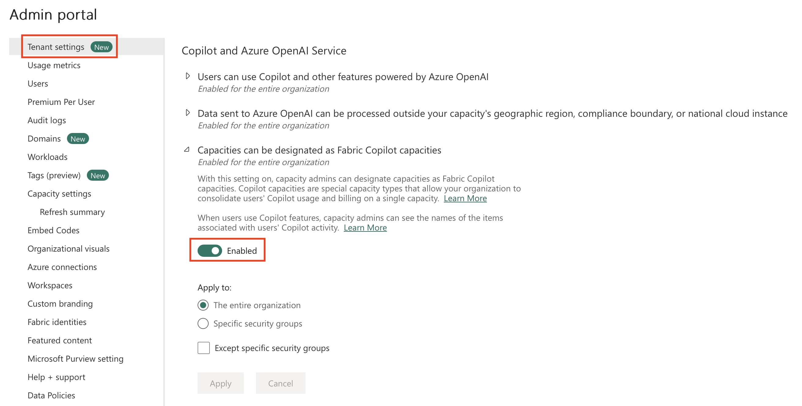 Οι ρυθμίσεις Copilot Fabric ελέγχονται από την ομάδα ρυθμίσεων μισθωτή Copilot και Azure OpenAI Service. Υπάρχουν πολλές ρυθμίσεις που διέπουν τις πολιτικές πρόσβασης χρηστών και επεξεργασίας δεδομένων και ορισμένες από αυτές είναι ενεργοποιημένες από προεπιλογή, ενώ άλλες απαιτούν την ενεργοποίησή τους από τον διαχειριστή Fabric.