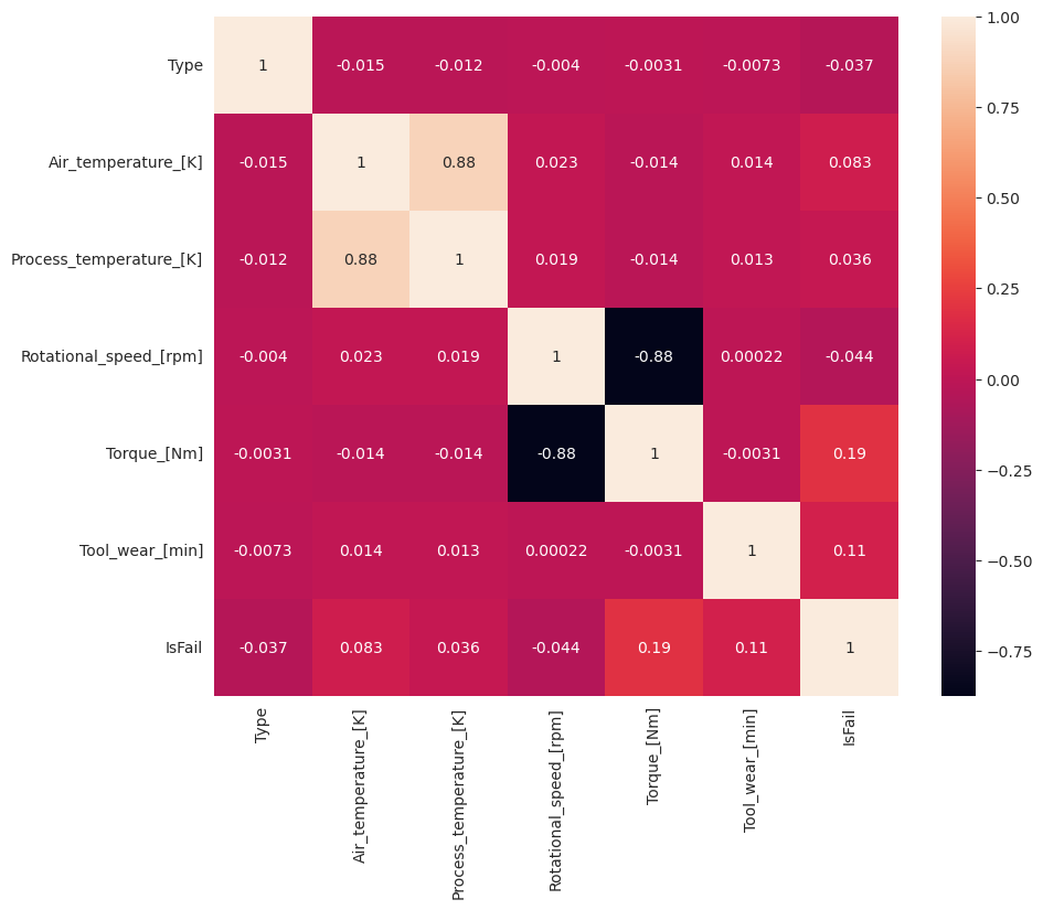| UDI | Αναγνωριστικό προϊόντος | Δακτυλογραφώ | Θερμοκρασία αέρα [K] | Θερμοκρασία διεργασίας [K] | Ταχύτητα περιστροφής [rpm] | Ροπή [Nm] | Χρήση εργαλείου [λεπτά] | Στόχος | Τύπος αποτυχίας |