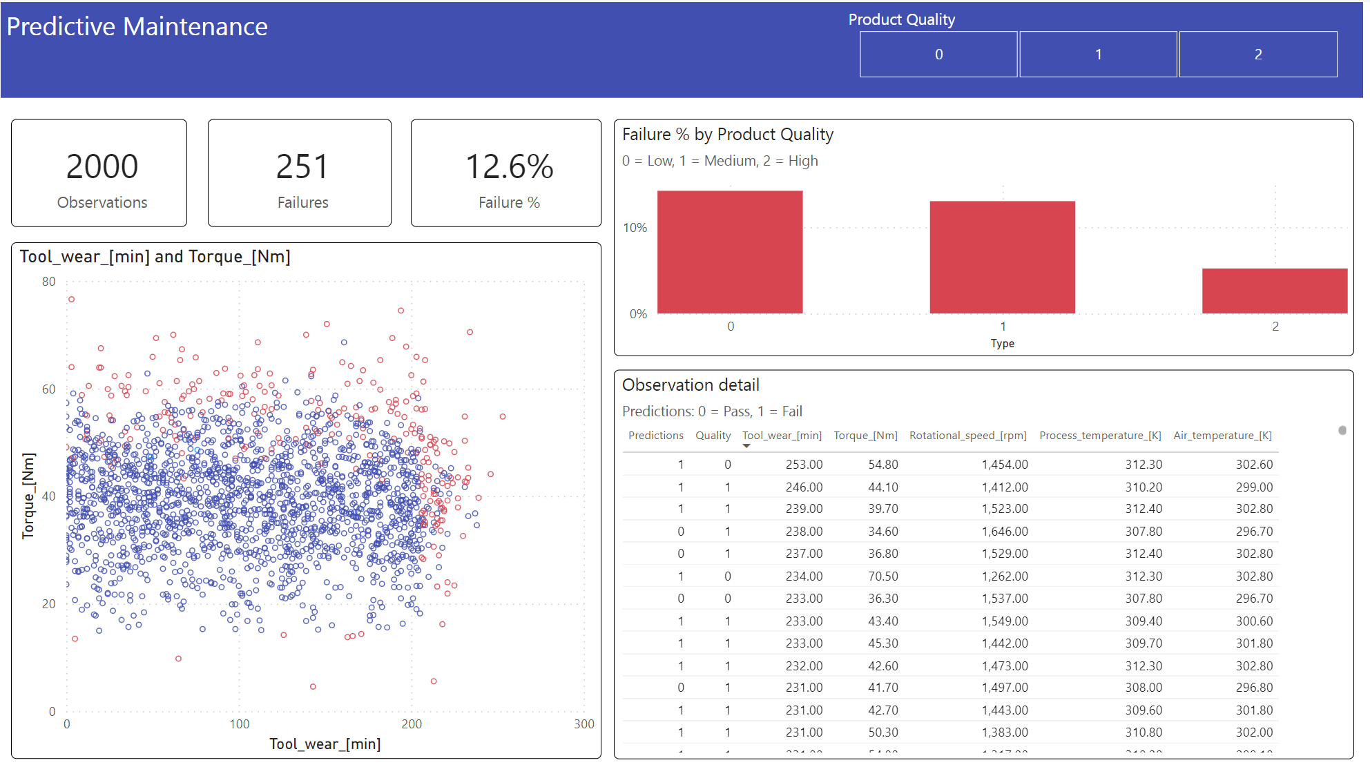 Ο πίνακας εργαλείων εμφανίζει ότι οι Tool_wear και Torque δημιουργούν ένα αισθητό όριο μεταξύ αποτυχημένων και μη αποτυχημένων υποθέσεων, όπως αναμένεται από την προηγούμενη ανάλυση συσχέτισης στο βήμα 2.