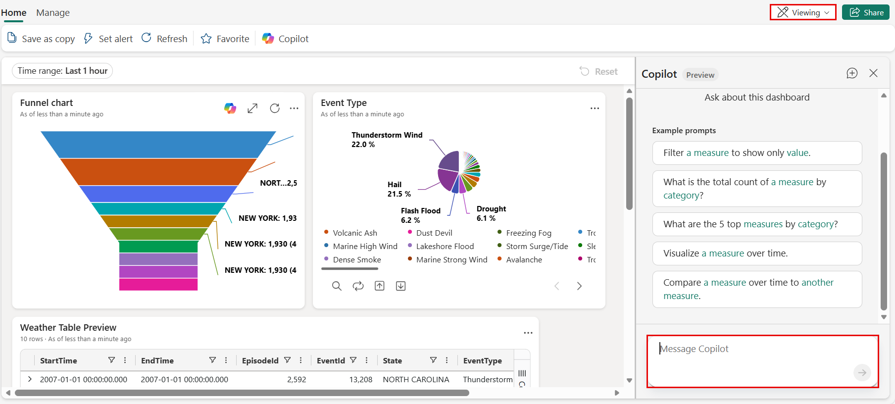 Αφού εξερευνήσετε δεδομένα χρησιμοποιώντας το Copilot, αποθηκεύστε πληροφορίες στον πίνακα εργαλείων για γρήγορη πρόσβαση, προβάλετε ροή ή ενημερώσεις σχεδόν σε πραγματικό χρόνο και μοιραστείτε τις με την ομάδα σας.