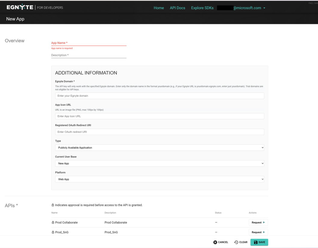 To create the API key and secret required for the connector, you need an Egnyte developer account. To register an Egnyte developer account: