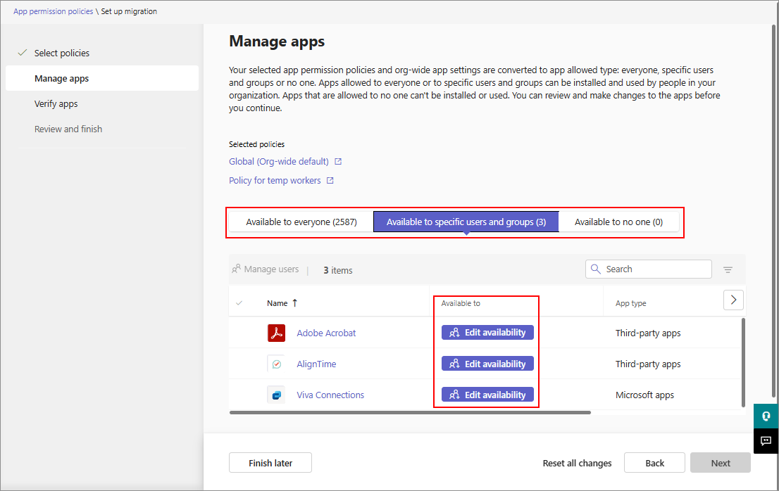 In each tab, you can modify the app availability to one of the three app availability types, as necessary. Edit availability option appears in Available to specific users and groups tab if the app availability isn't clear and admin input is needed to proceed. Either the apps aren't present in the policies that you selected to migrate or selected policies contain conflicting availability. You must assign such apps to one of the availability types before you can proceed.