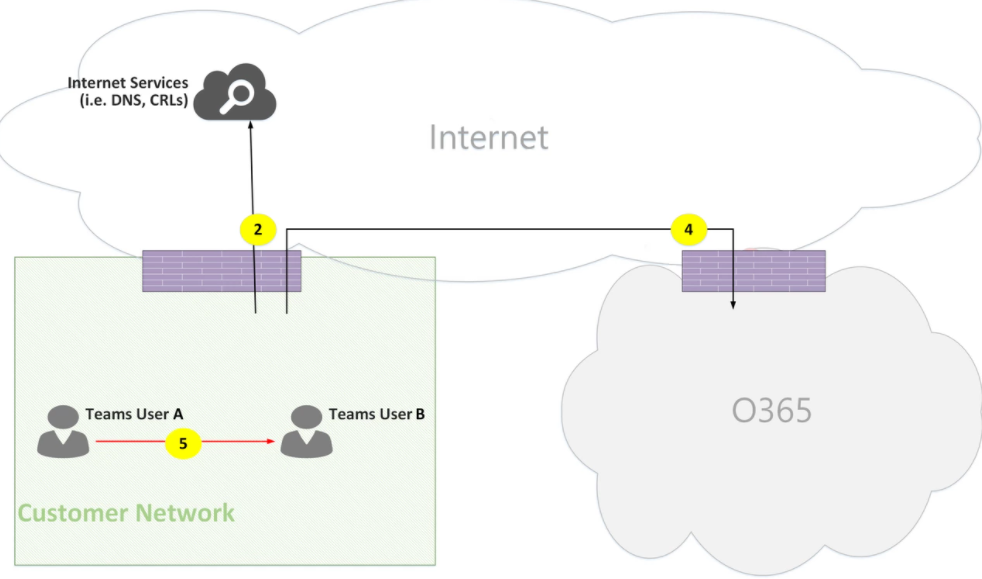 - Flow 5 – Represents a peer-to-peer media flow between a Teams user and another Teams or Skype for Business user within the customer network.