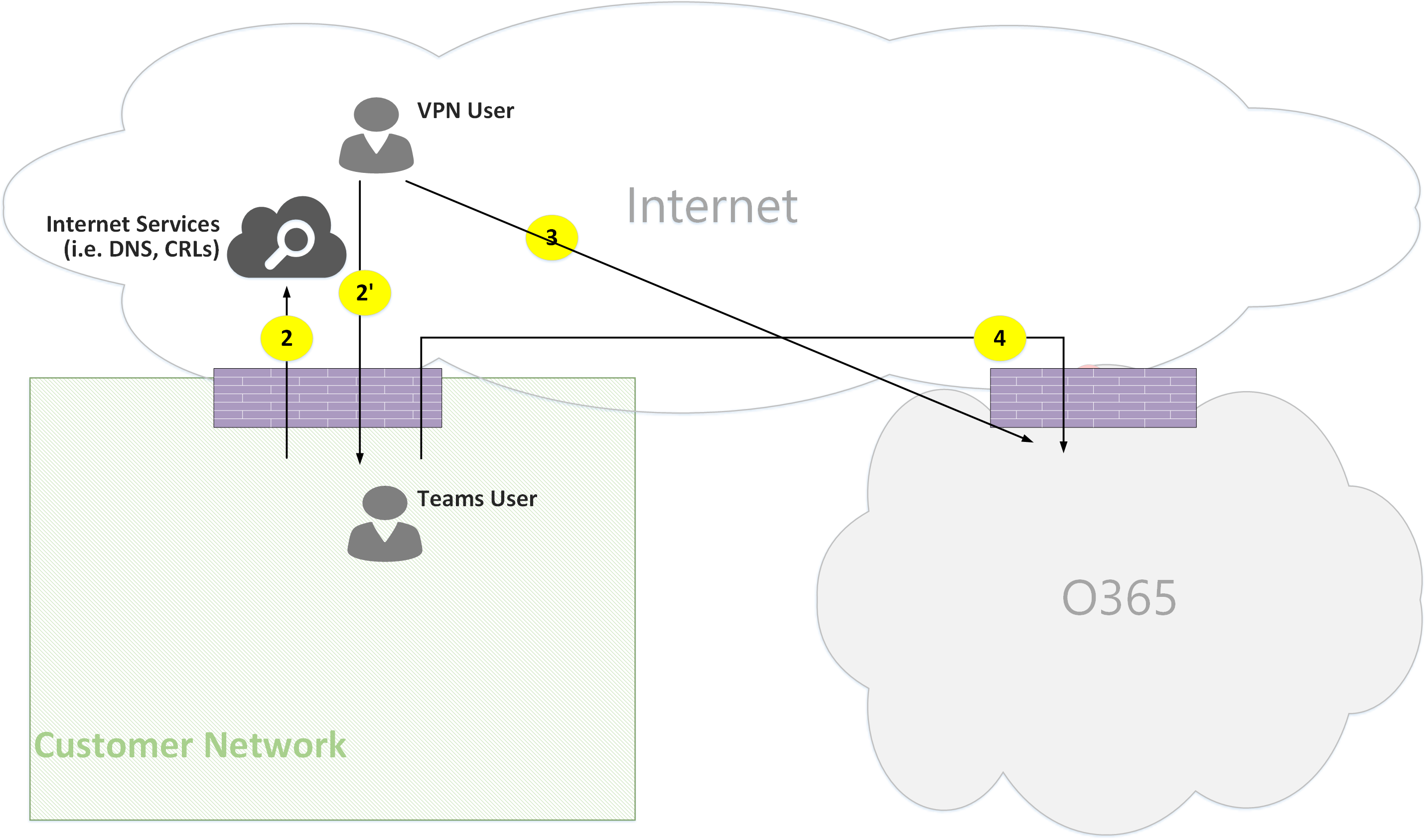 Signaling between the VPN to the customer network is using flow 2'. Signaling between the customer network and Microsoft 365 is using flow 4. However, media bypasses the VPN and is routed using flow 2 from the customer network to the Internet.