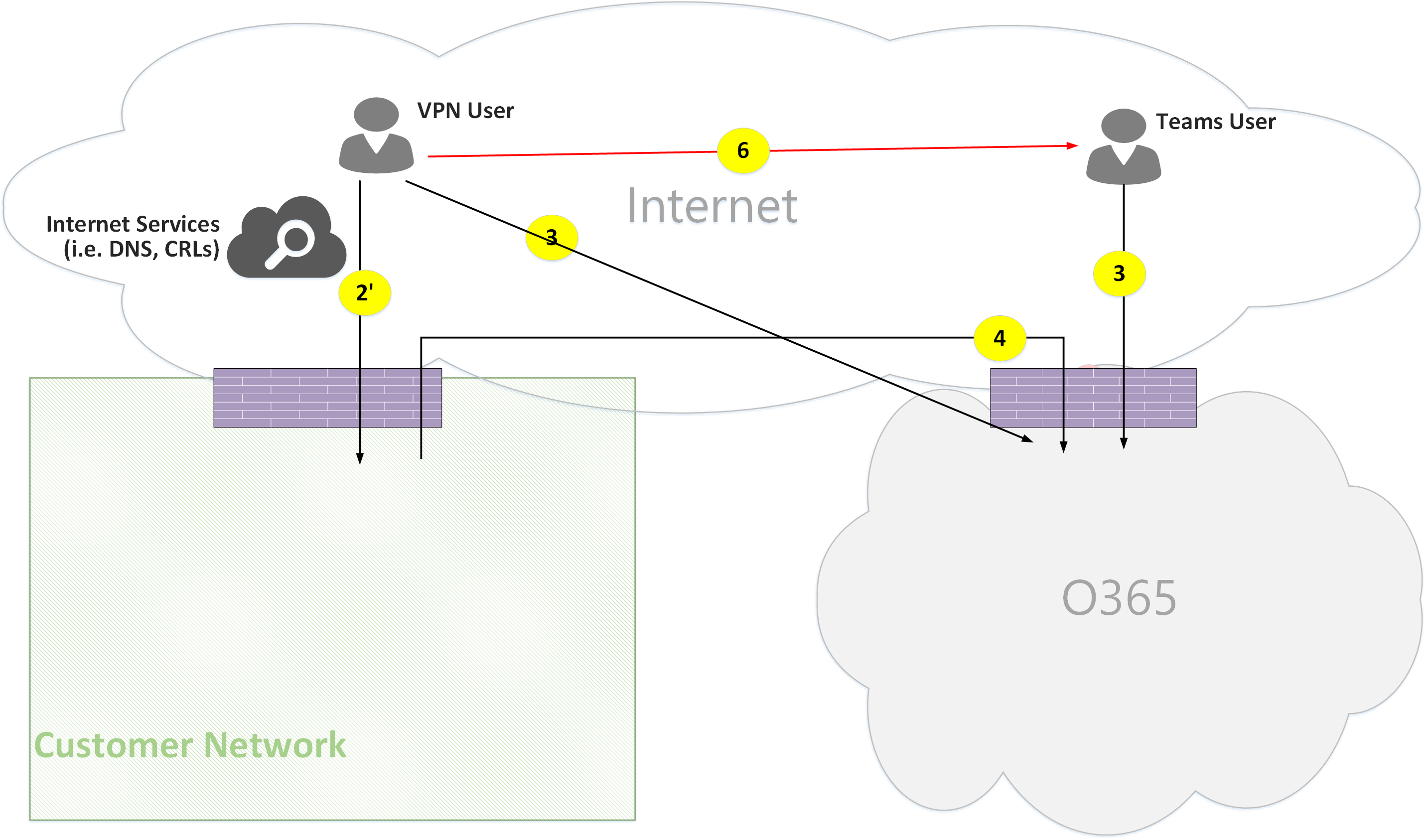 Signaling between the VPN to the customer network is using flow 2'. Signaling between the customer network and Microsoft 365 is using flow 4. However, media bypasses the VPN and is routed using flows 3 and 4 through Teams media relay in Microsoft 365.