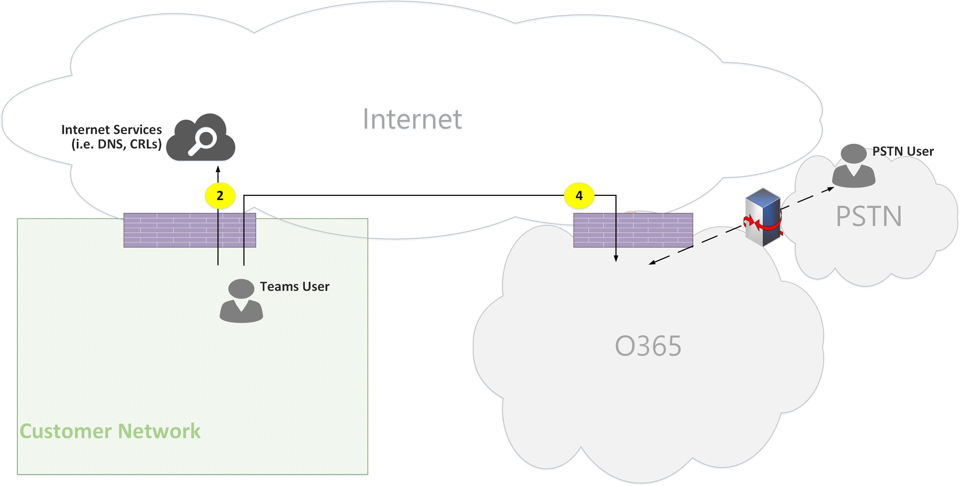 - Teams User within customer network resolves URL domain name (DNS) using flow2.
