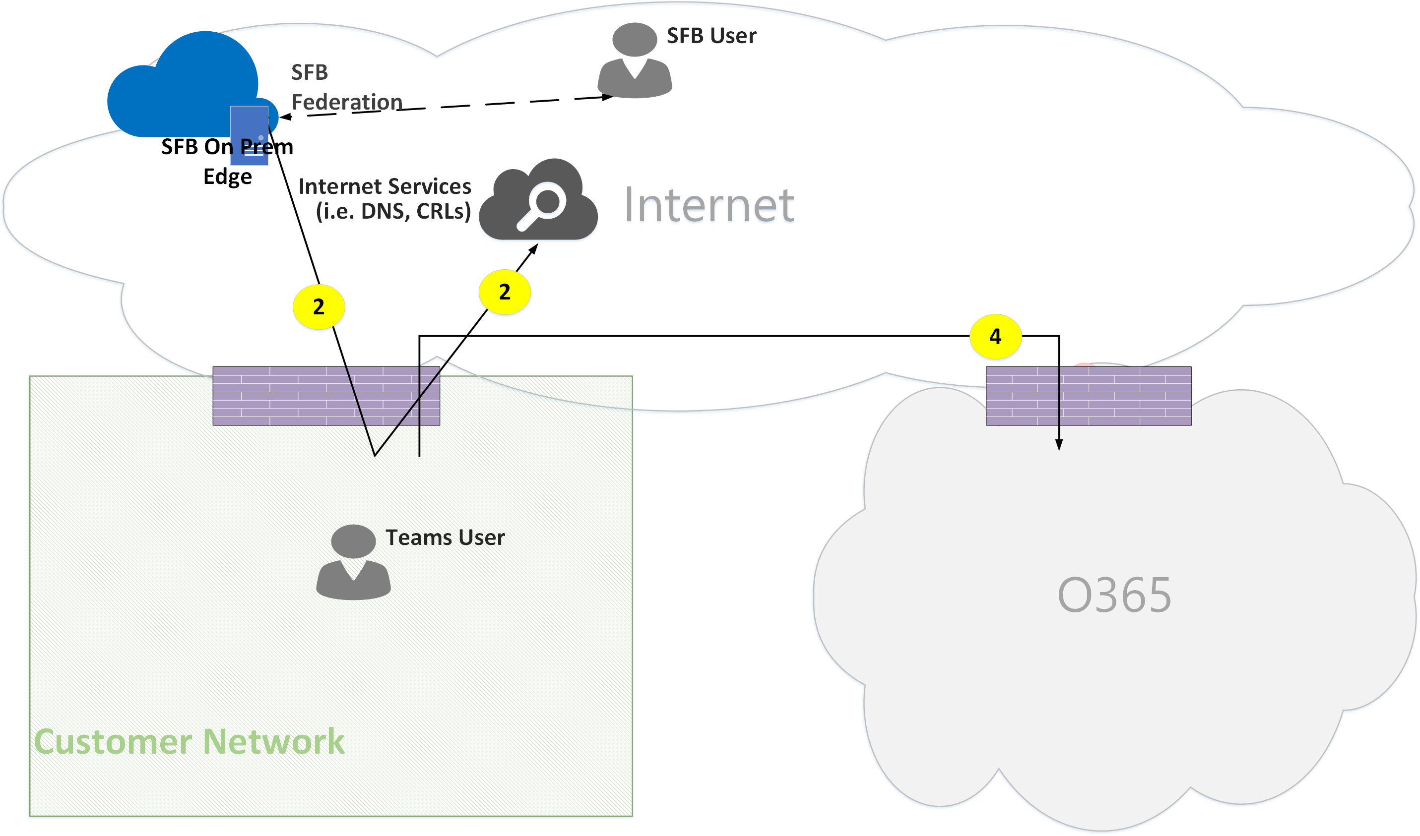 Federation is, by definition, a communication between two tenants. In this case, tenant A, which uses Teams, federates with tenant B, which uses Skype for Business on premises. If tenant B is also using Microsoft 365, then the Skype for Business client would have used flow 3 to connect with Microsoft 365.
