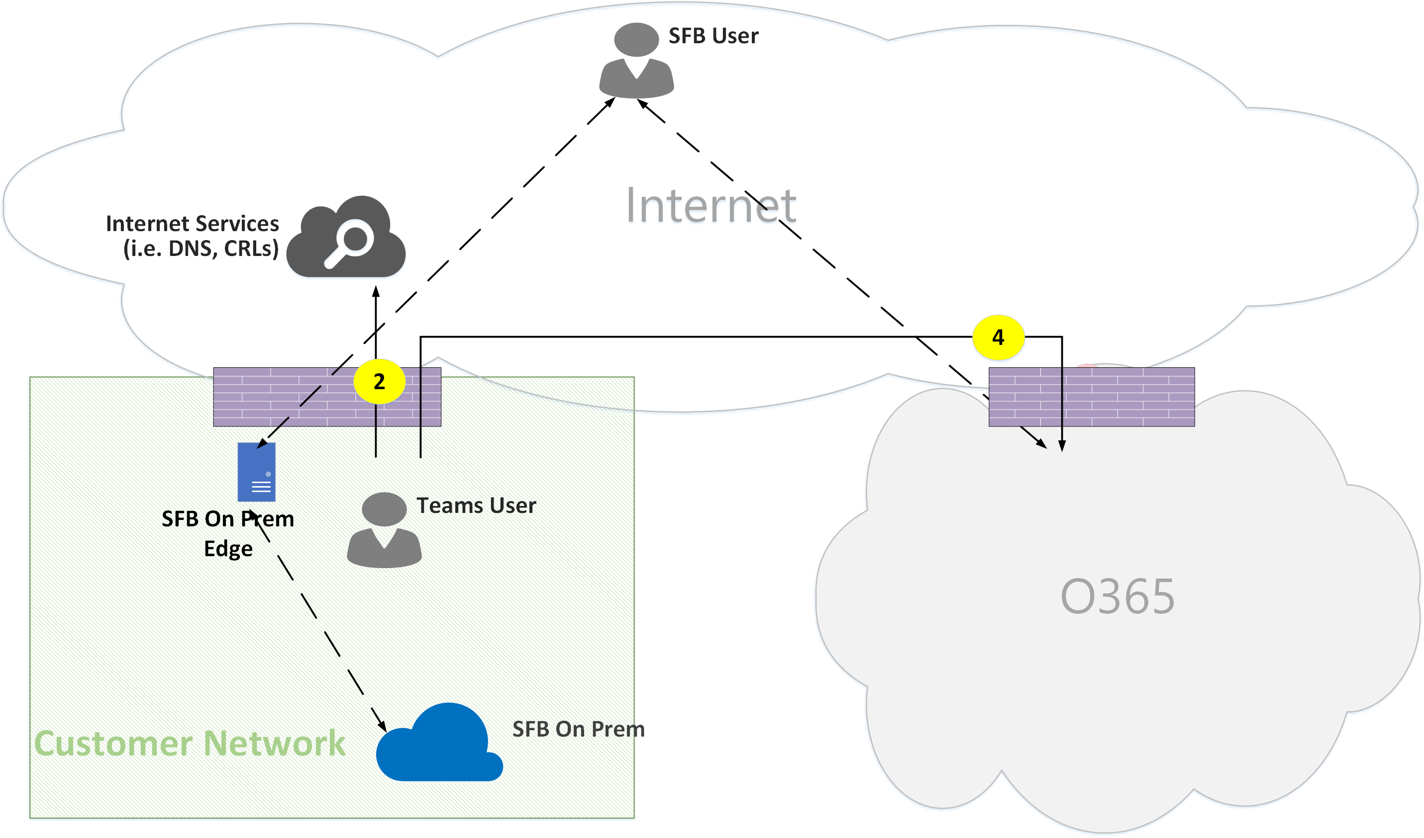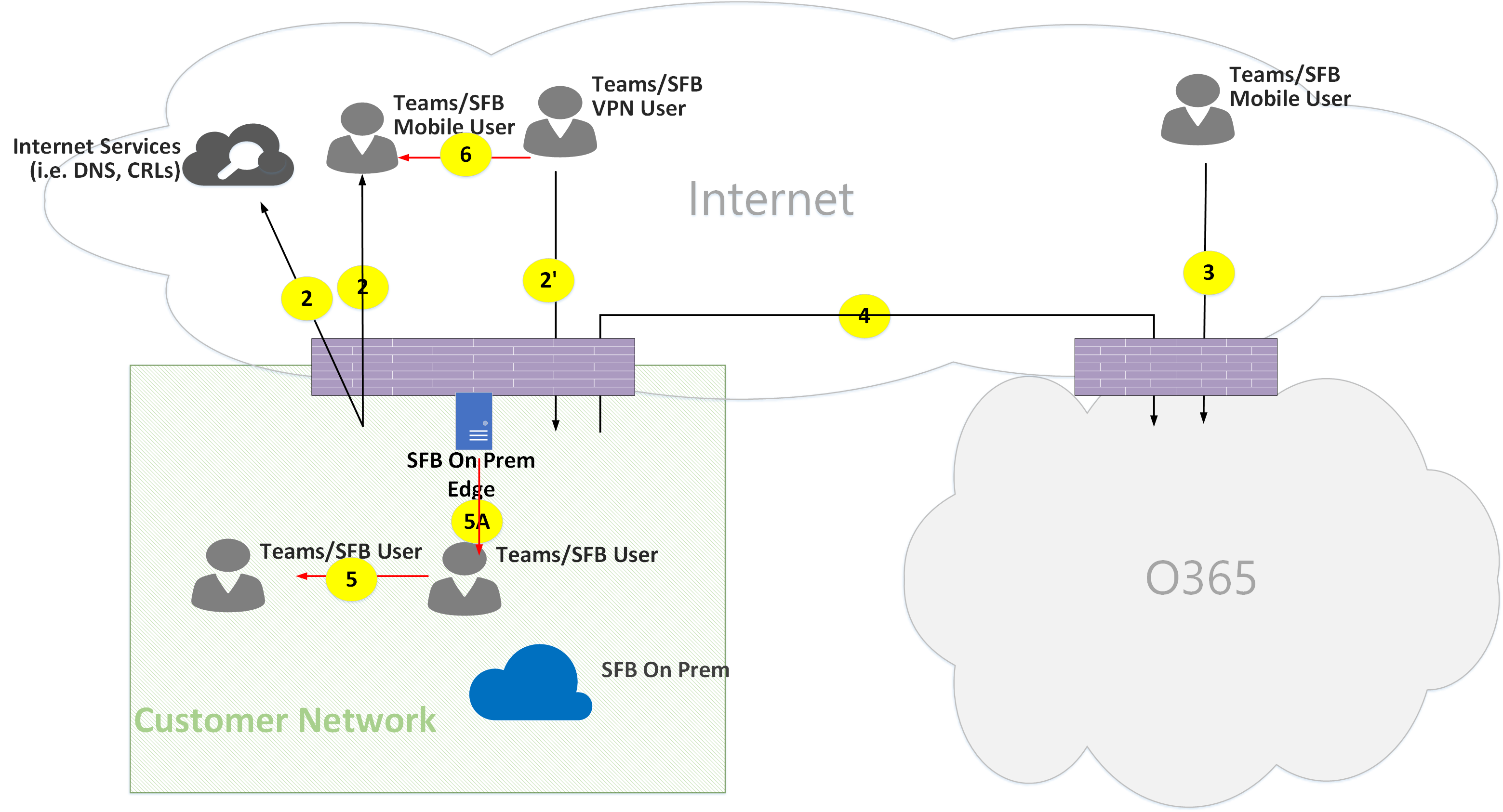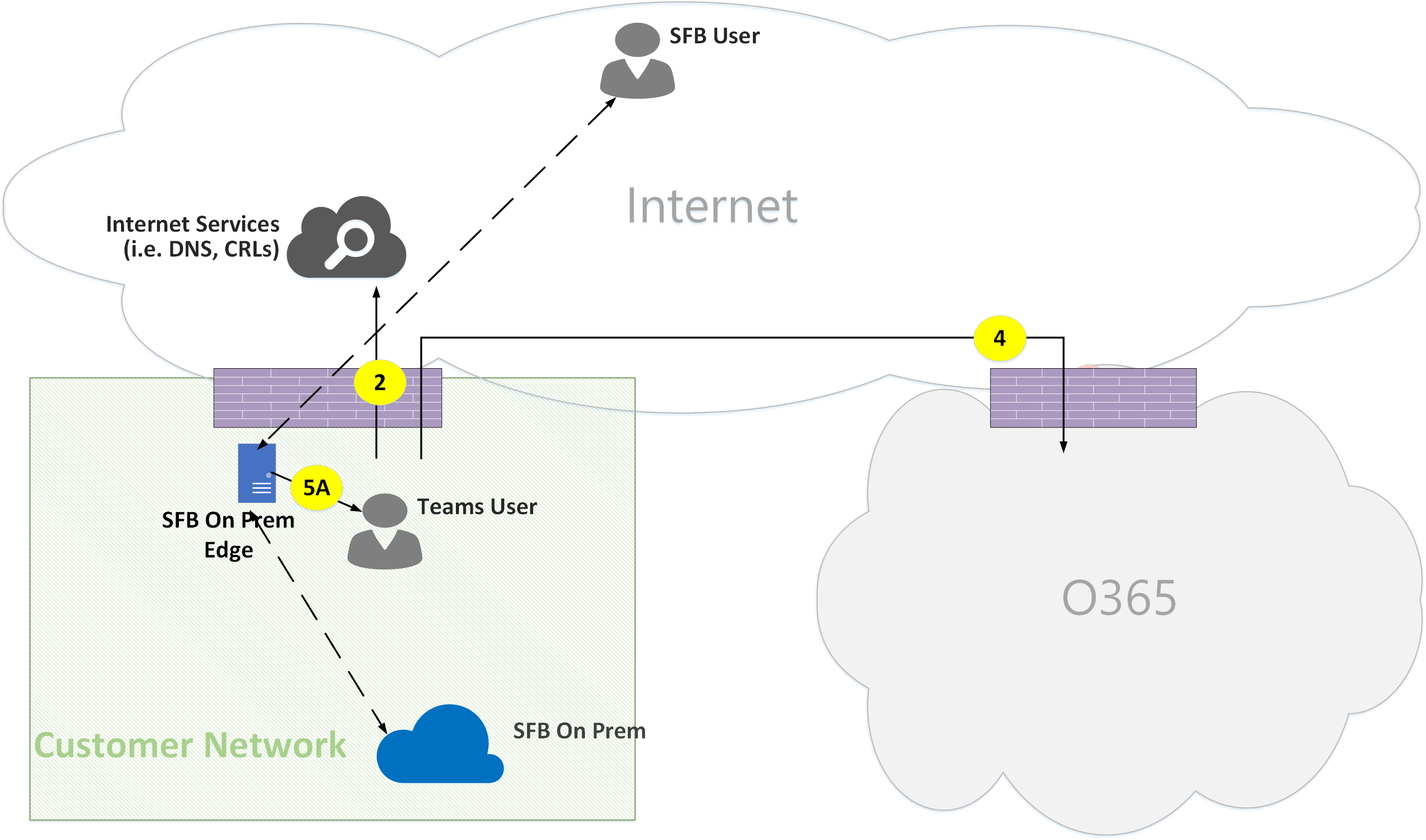 - Flow 5A – Represents a peer-to-peer media flow between a Teams user within the customer network and a Skype for Business on-premises media relay at the customer network edge.