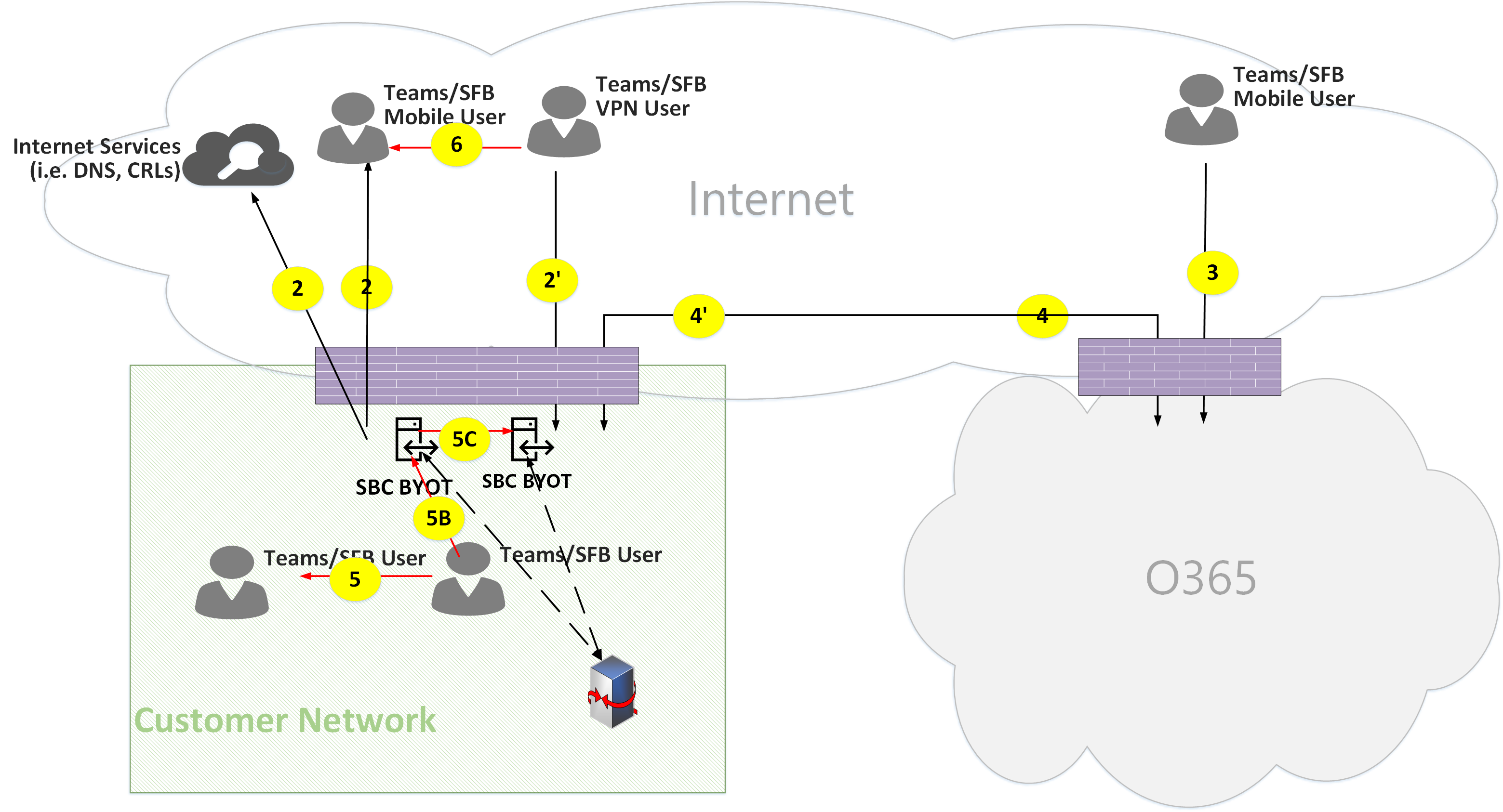- Flow 2' – Represents a flow initiated by a remote mobile Teams user, with VPN to the customer network.