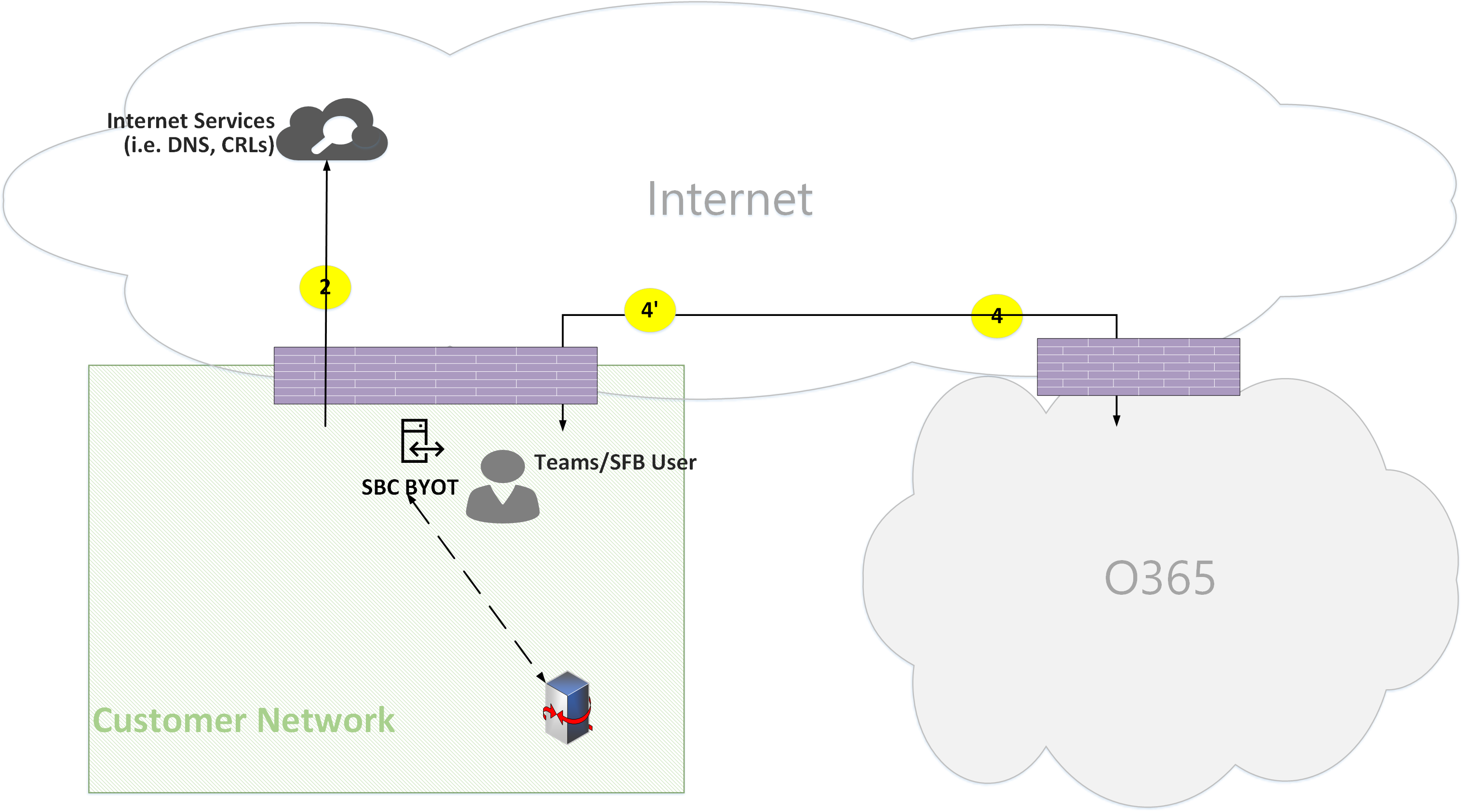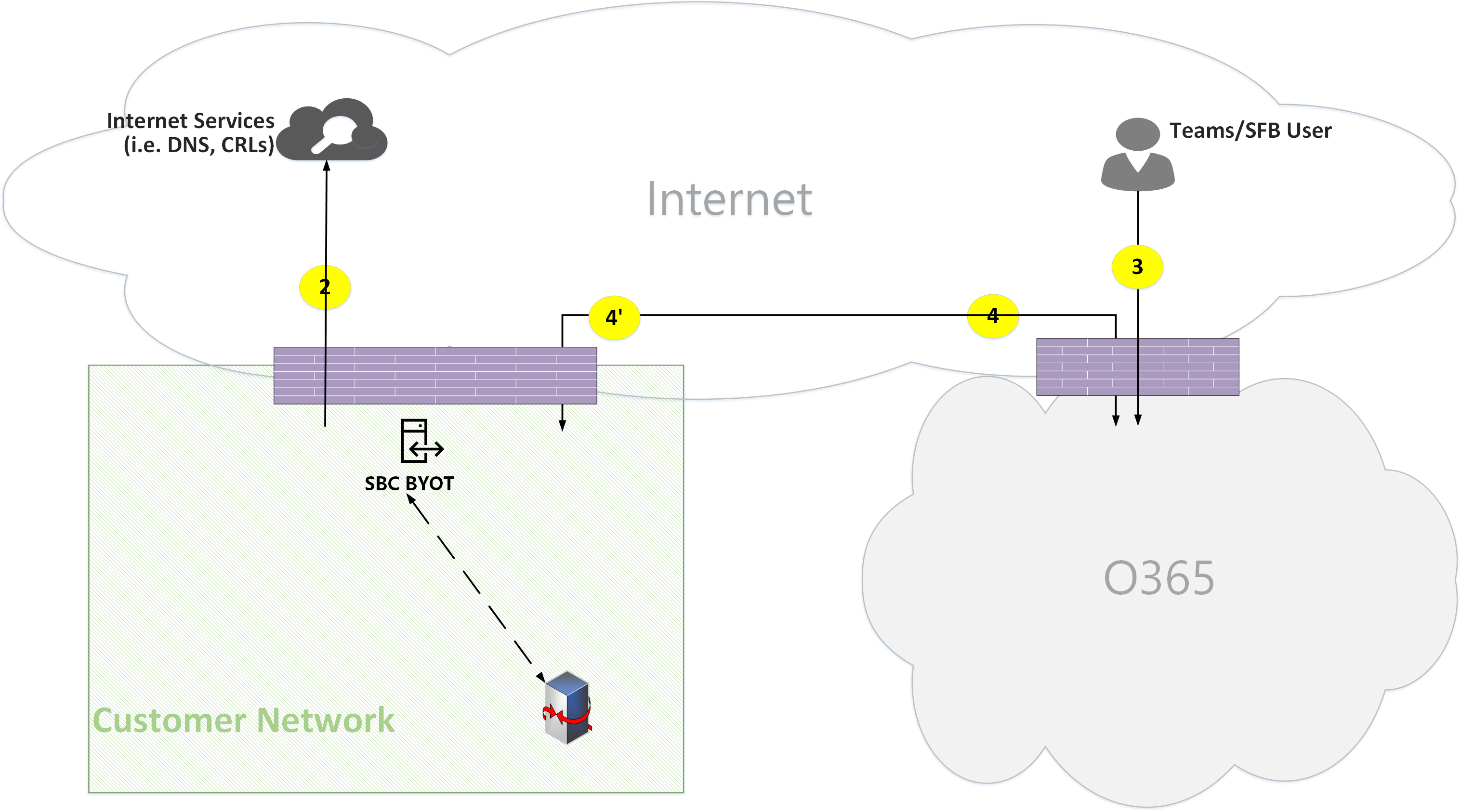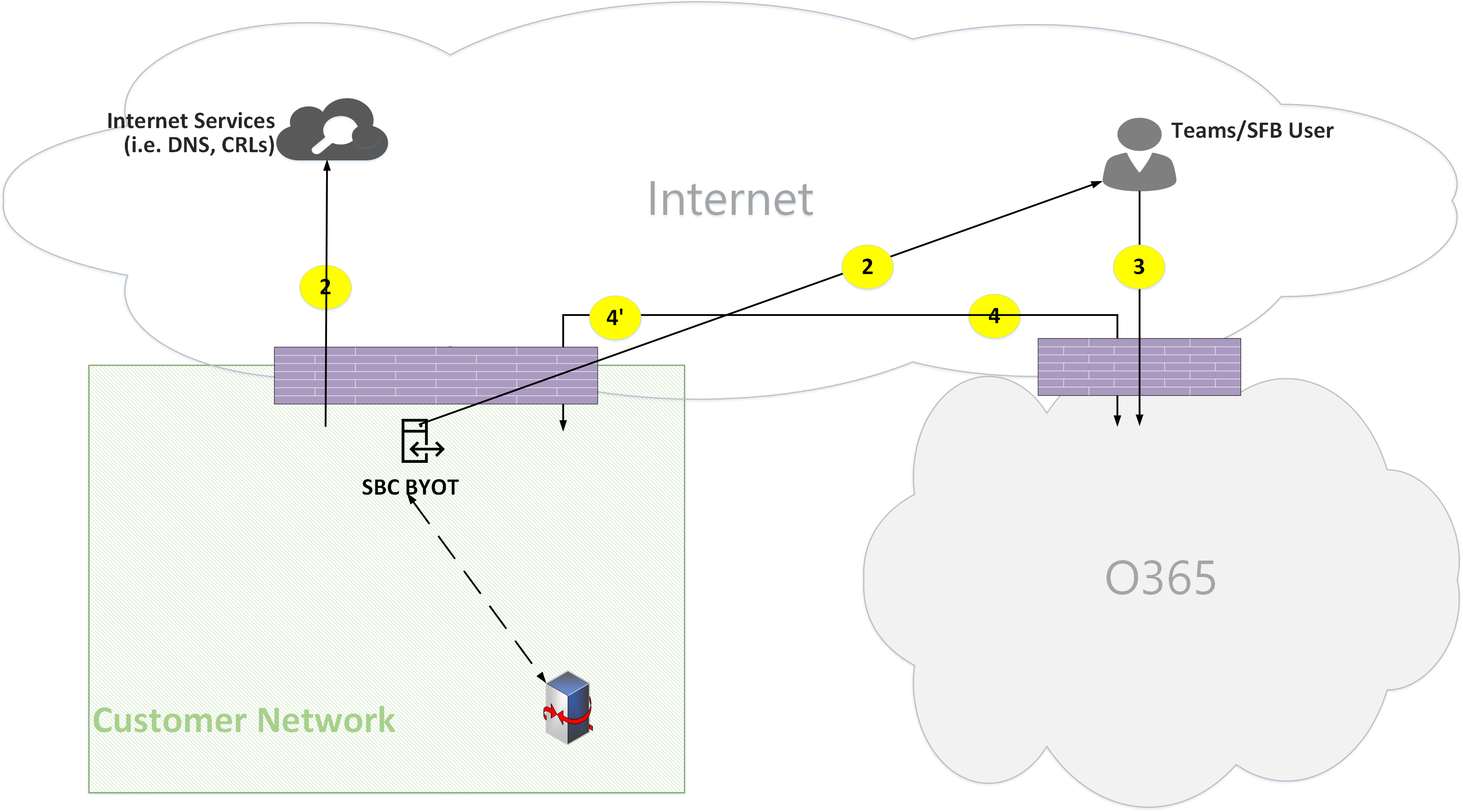 - Flow 4' - Represents a flow from Microsoft 365 to the customer network, used to establish a connection between the Teams media server in the cloud with the SBC on premises.