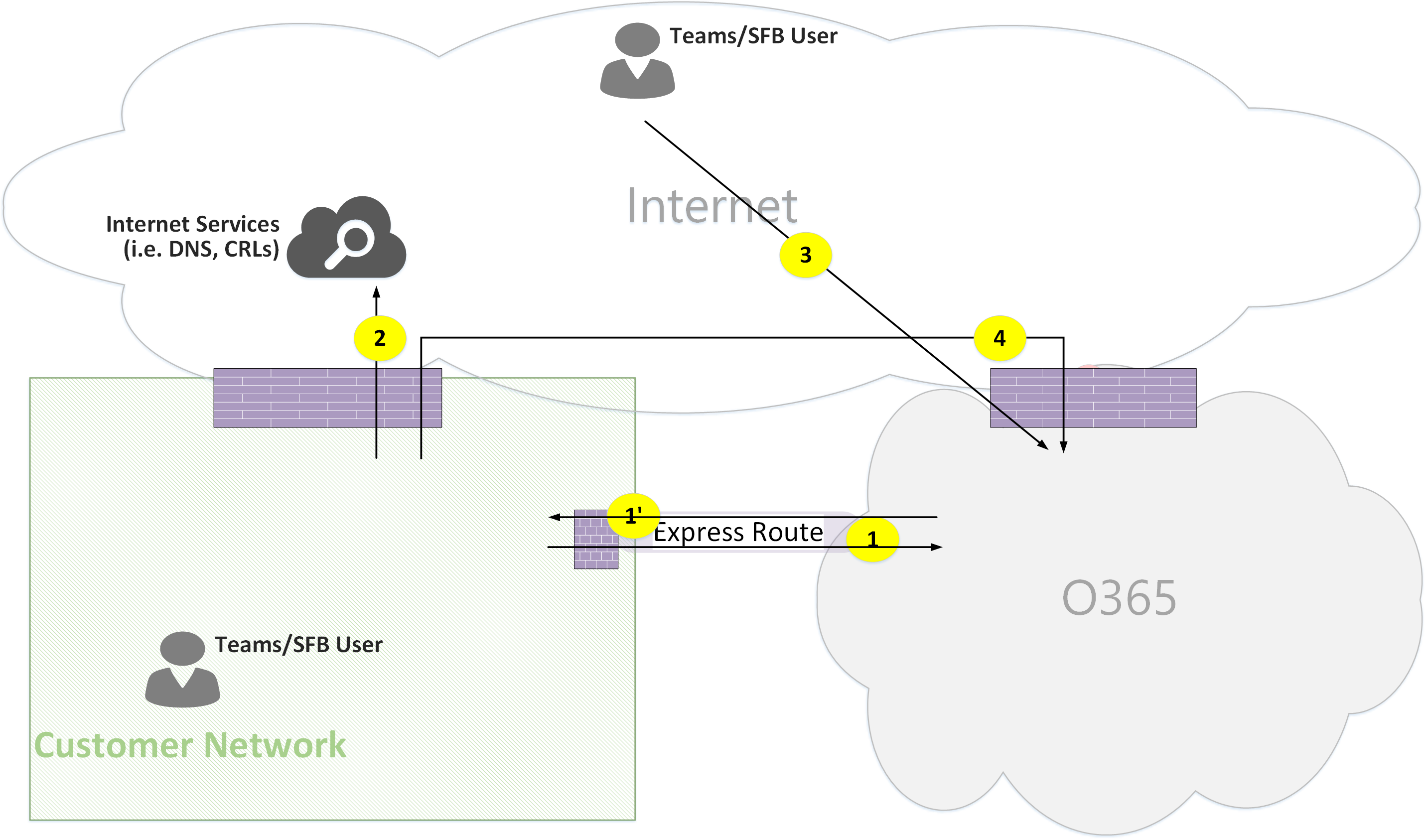 In the case that Express Route is justified and deployed, then Teams flows could be re-routed from flow 4 to flow 1 and from flow 4' to flow 1'. However, the Teams application has a hard dependency on other Microsoft 365 flows over the Internet using flows 4 and 4'; hence these flows must not be blocked.