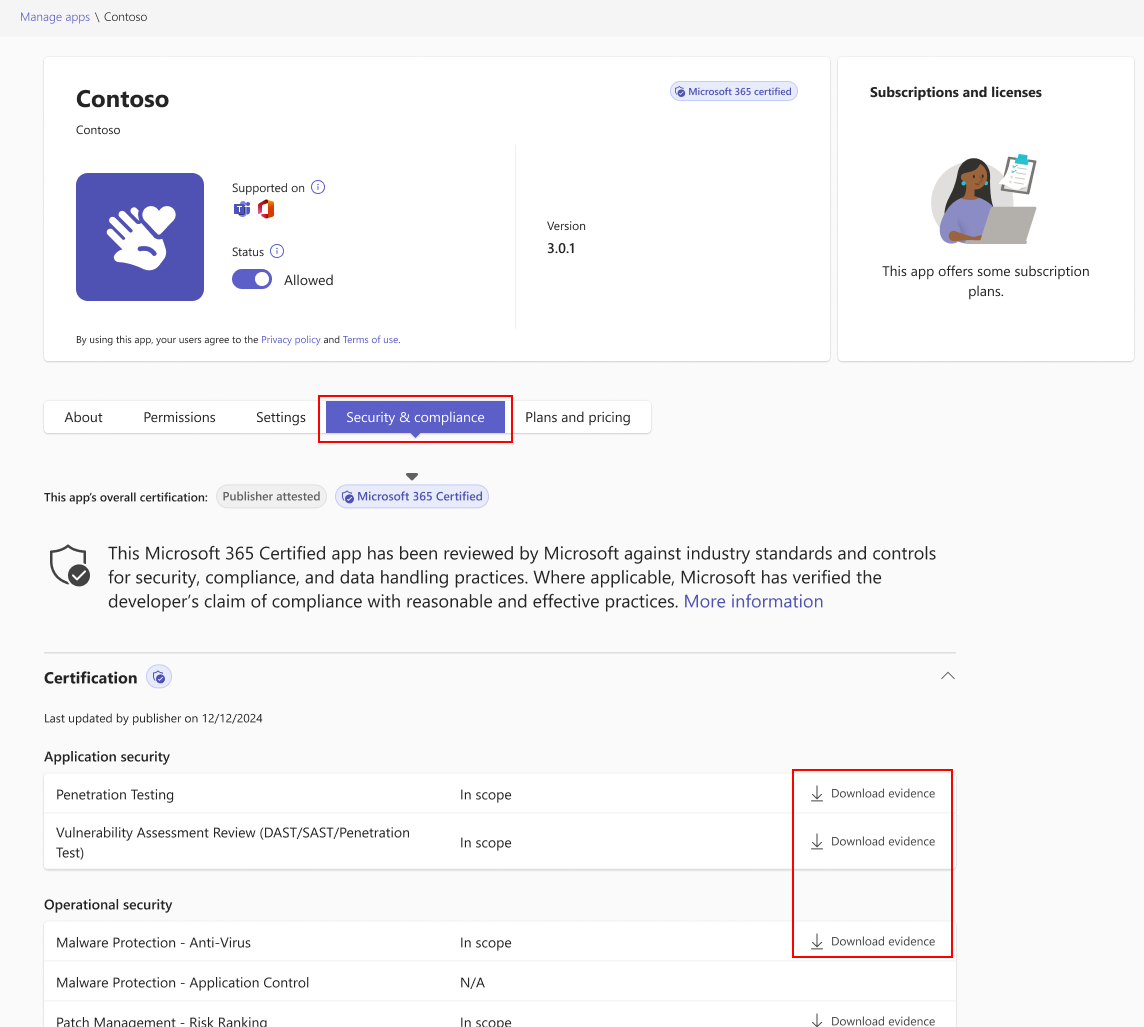 Developers of some Microsoft 365 certified apps and Copilot agents can choose to provide detailed evidences to help your organization quickly assess their app. Developers submit the comprehensive details as part of the audits done during certification. If developers agree to share the detailed evidences, then you can download these app trust evidences from the app details page in the Teams admin center. The download option is available only in commercial tenants.