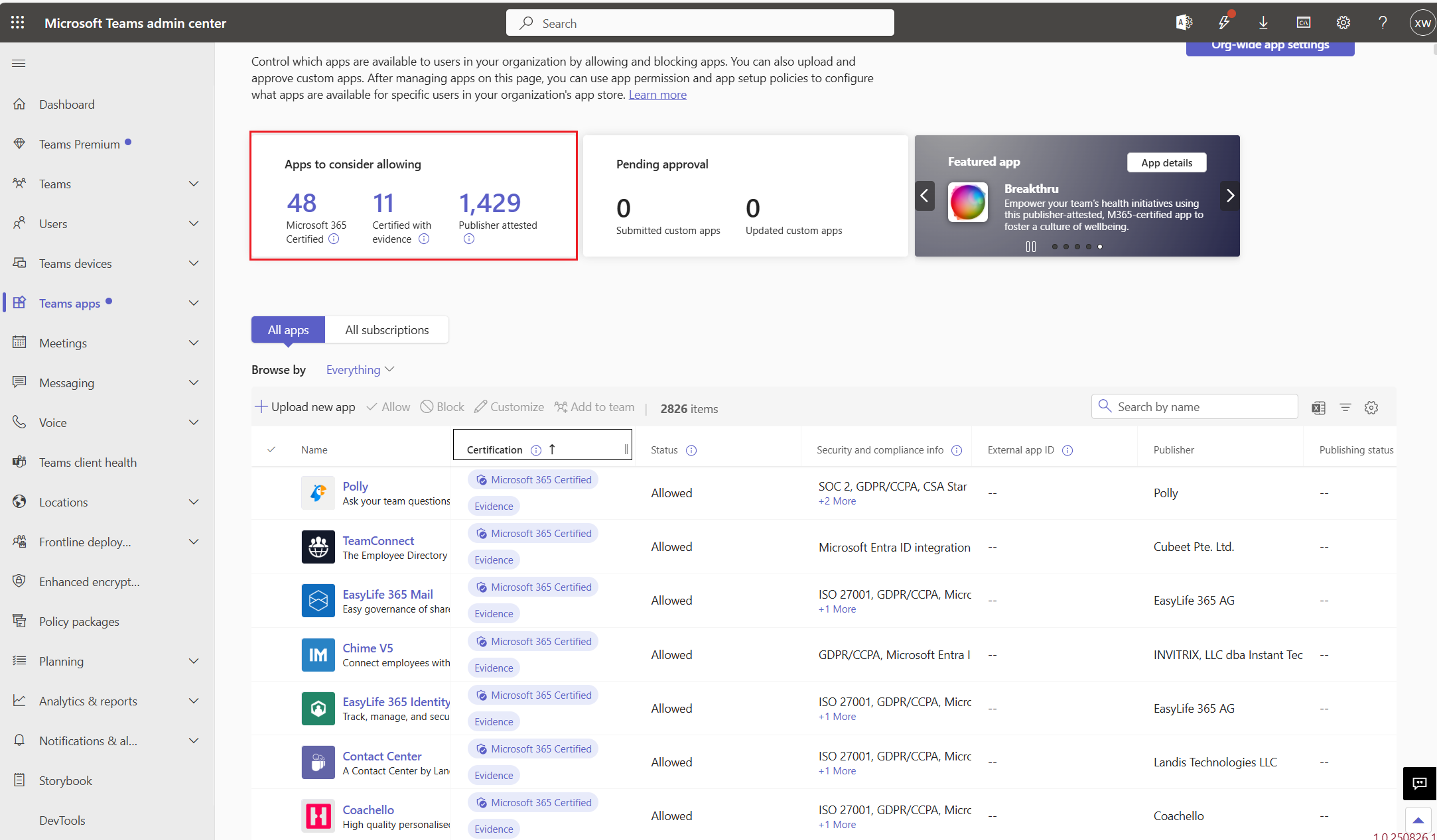 Teams admin center provides enhanced tools and expanded security and compliance insights to streamline app and agent evaluations. You can view security and compliance data, when available, for apps beyond Microsoft 365 certified or publisher-attested ones, powered by MDA. Trust-based filters help narrow choices by industry-standard attributes such as SOC 2, ISO 27001, HIPAA, and GDPR, enabling faster, more informed approval decisions.