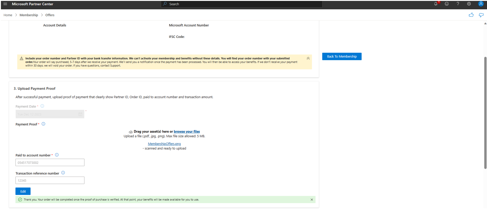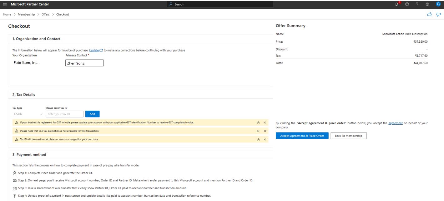 To process any membership offer purchase, a billing Profile must be created/linked in Partner Center.