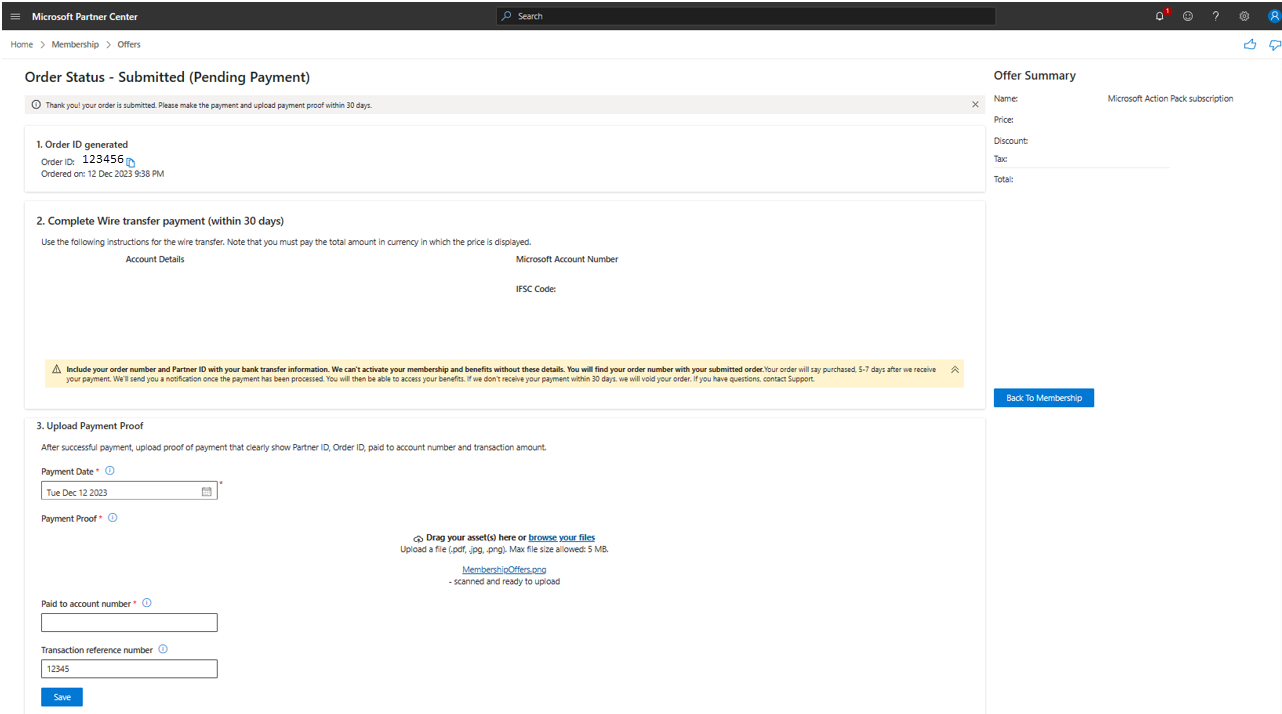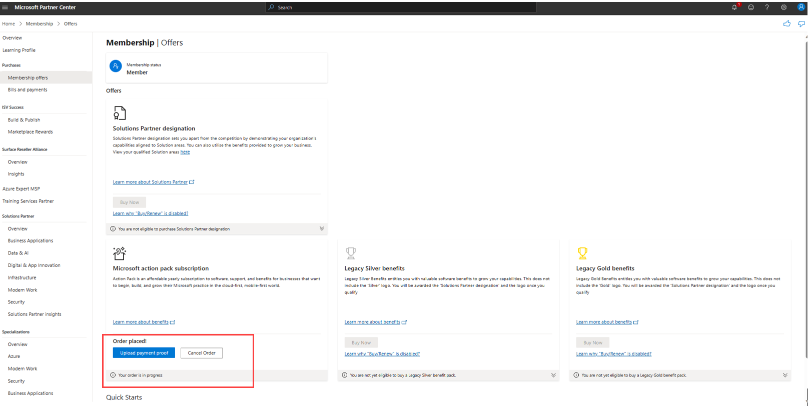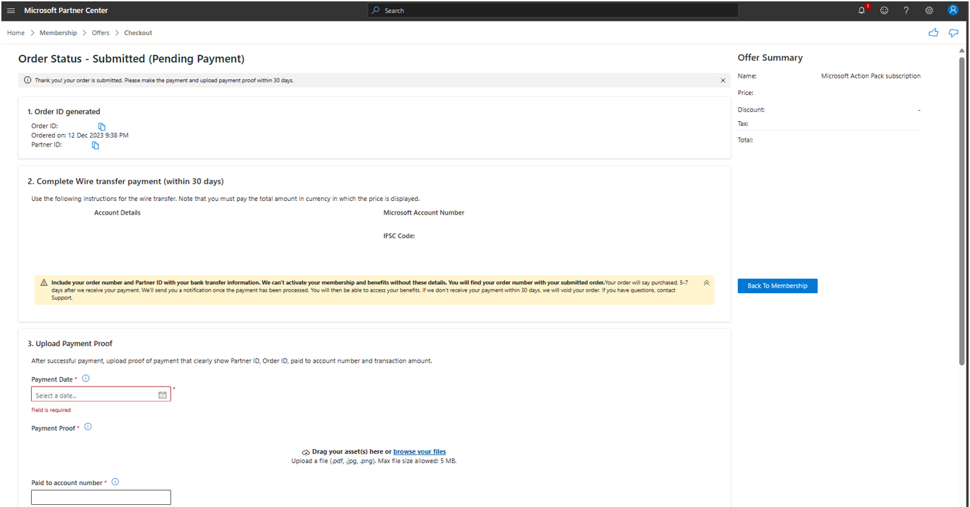 On the Membership Offers page, go to the offer that you purchased (Microsoft Action Pack, Solutions Partner legacy pack, or any other offer). Then select Upload payment proof.