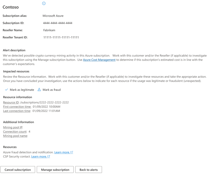 To cancel the Azure subscription, select Continue with cancellation. When you select Continue with cancellation, the subscription is canceled and all alerts for that subscription are marked Resolved with the reason Fraud.