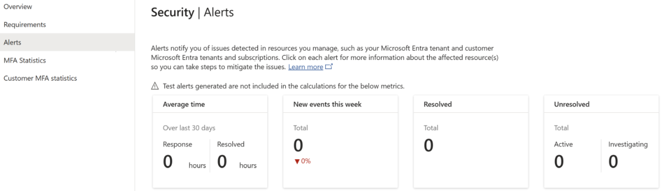 The Partner Center Security Alerts dashboard helps you respond quickly to security, fraud, and other events that occur in Partner Center or your customer's tenant.