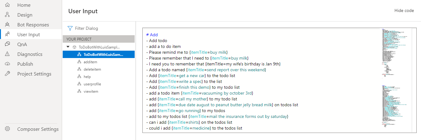 Minimap: When Minimap is turned On, a mini map will be enabled in the Bot Responses and User Input editors.