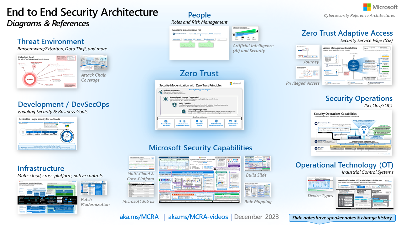The Microsoft Cybersecurity Reference Architectures (MCRA) are technical architectures to enable you to adopt end-to-end security using Zero Trust principles. MCRA describes end-to-end security for the ‘hybrid of everything’ technology estate spanning legacy IT, multicloud, Internet of Things (IoT), Operational Technology (OT), Artificial Intelligence (AI), and more.