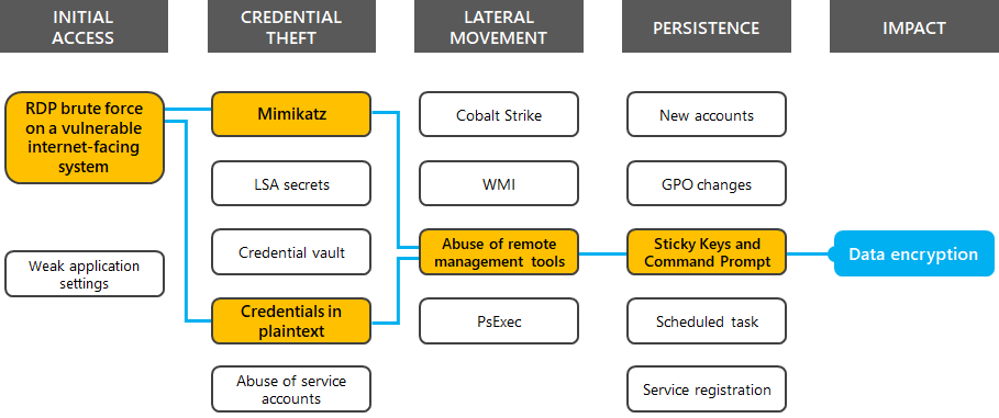 For this incident, Microsoft Incident Response managed to locate a device that had TCP port 3389 for RDP exposed to the Internet. This allowed threat actors to perform a brute-force authentication attack and gain the initial foothold.