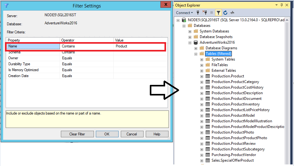 In databases that have many objects, you can use filtering to reduce the list of objects to display specific tables, views, etc. This section describes how to filter tables, but you can use the following steps in any other nodes in Object Explorer: